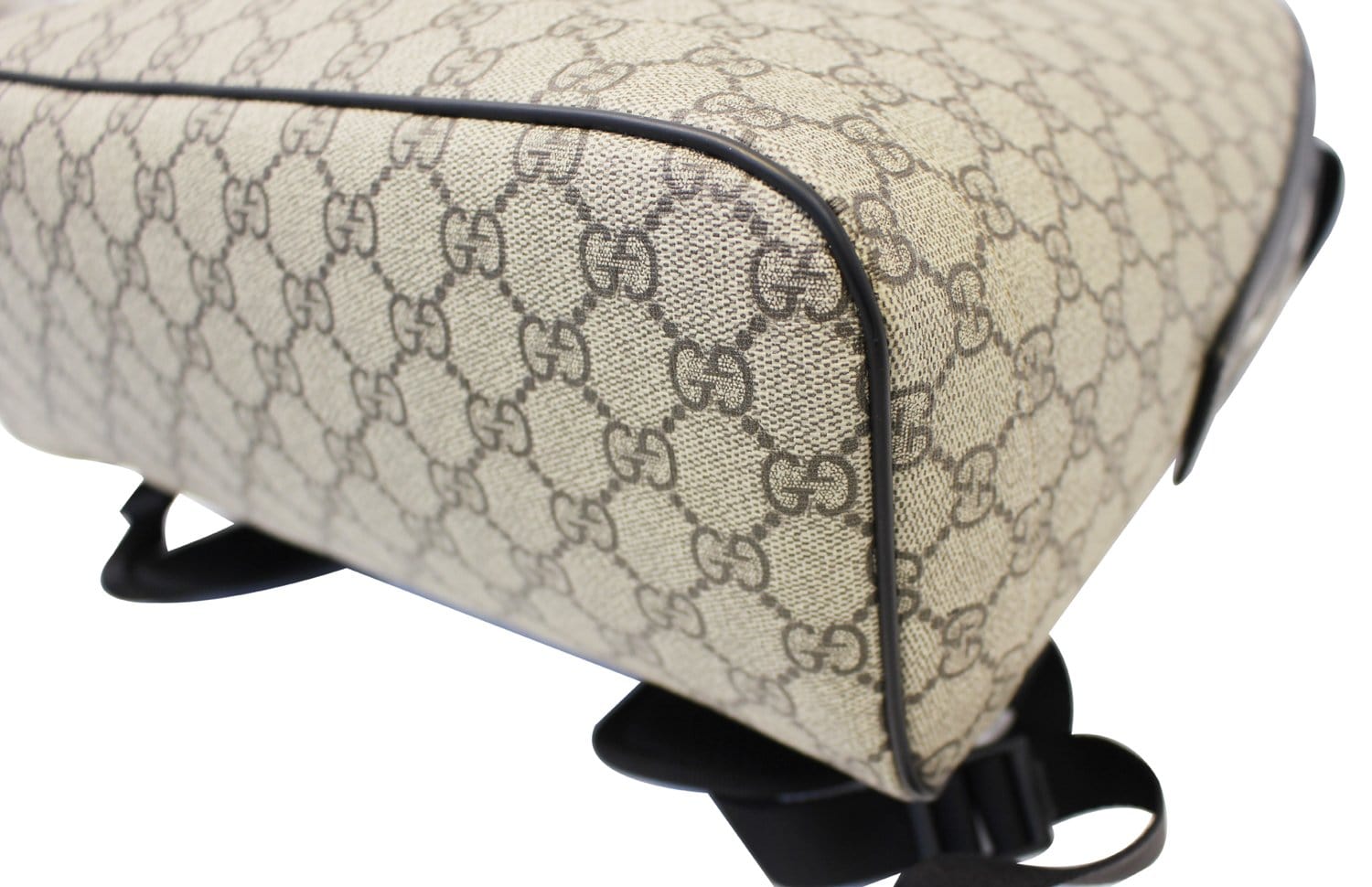 Gucci the Web is found along the front of a GG Supreme canvas backpack, trimmed with black leather. This style is equipped with mesh-lined shoulder straps and interior pockets for smartphone and tablet.