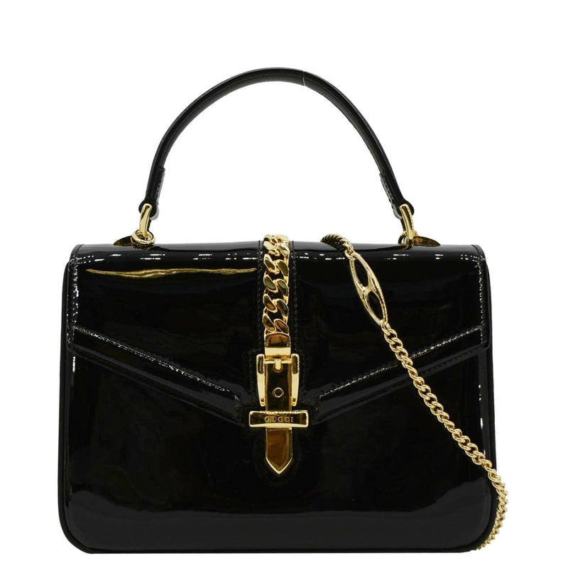 The GUCCI Sylvie 1969 Patent Leather Top Handle Crossbody Bag in Black (model 589478) blends vintage charm with modern elegance, featuring glossy patent leather, a structured top handle, and the signature Sylvie chain detail.