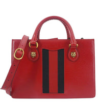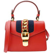 The GUCCI Sylvie Mini Leather Top Handle Crossbody Bag in Hibiscus Red is a striking piece, featuring smooth red leather with a signature web stripe and gold-tone chain detail. Compact yet elegant, this bag offers versatile styling with both top handles and crossbody options.