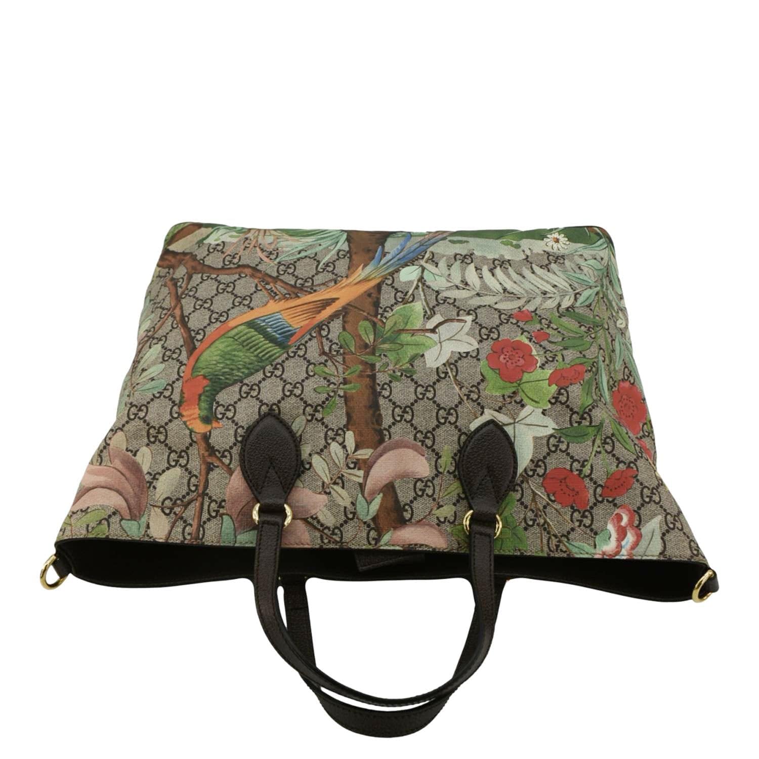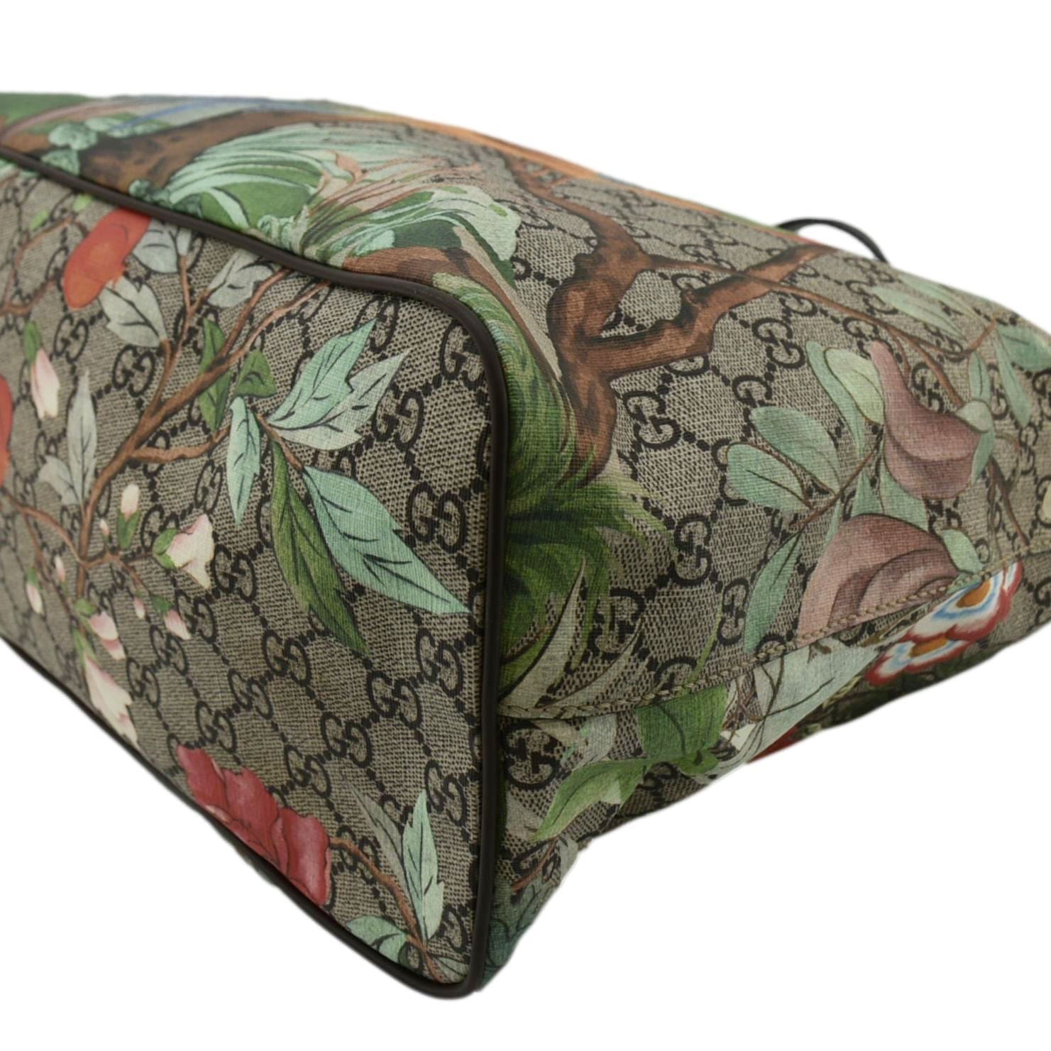 The Gucci Tian Print GG Supreme Canvas Tote Shoulder Bag in Beige features the iconic GG Supreme canvas adorned with vibrant floral and bird motifs. Its spacious design, with leather handles and trim, offers a stylish blend of practicality and artistic flair.