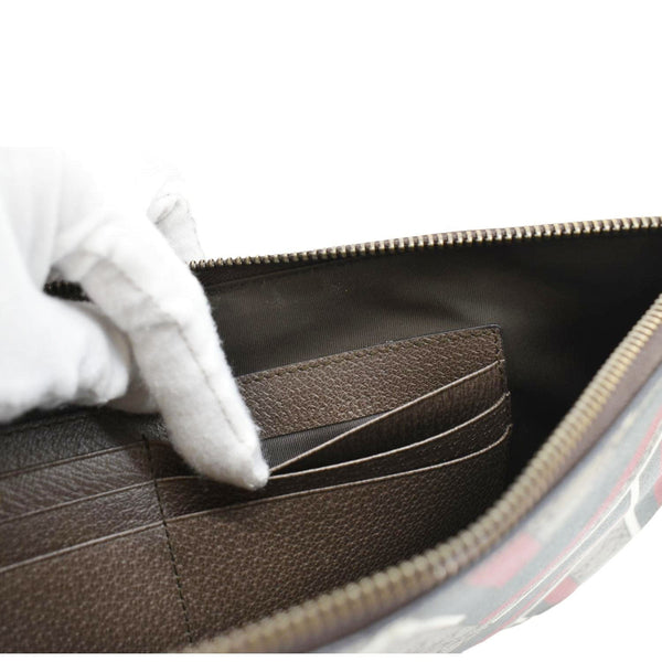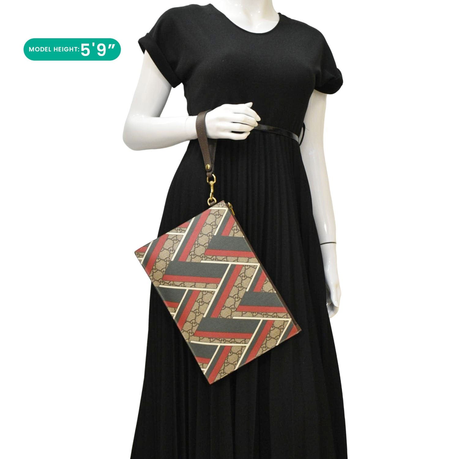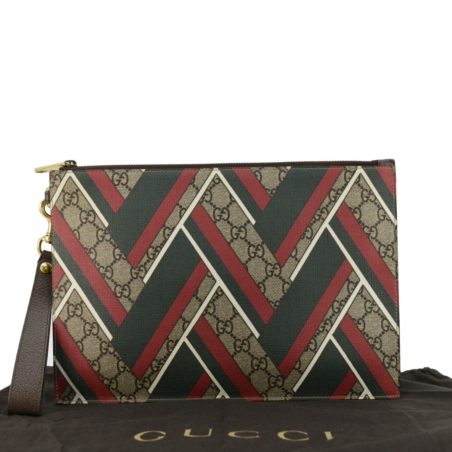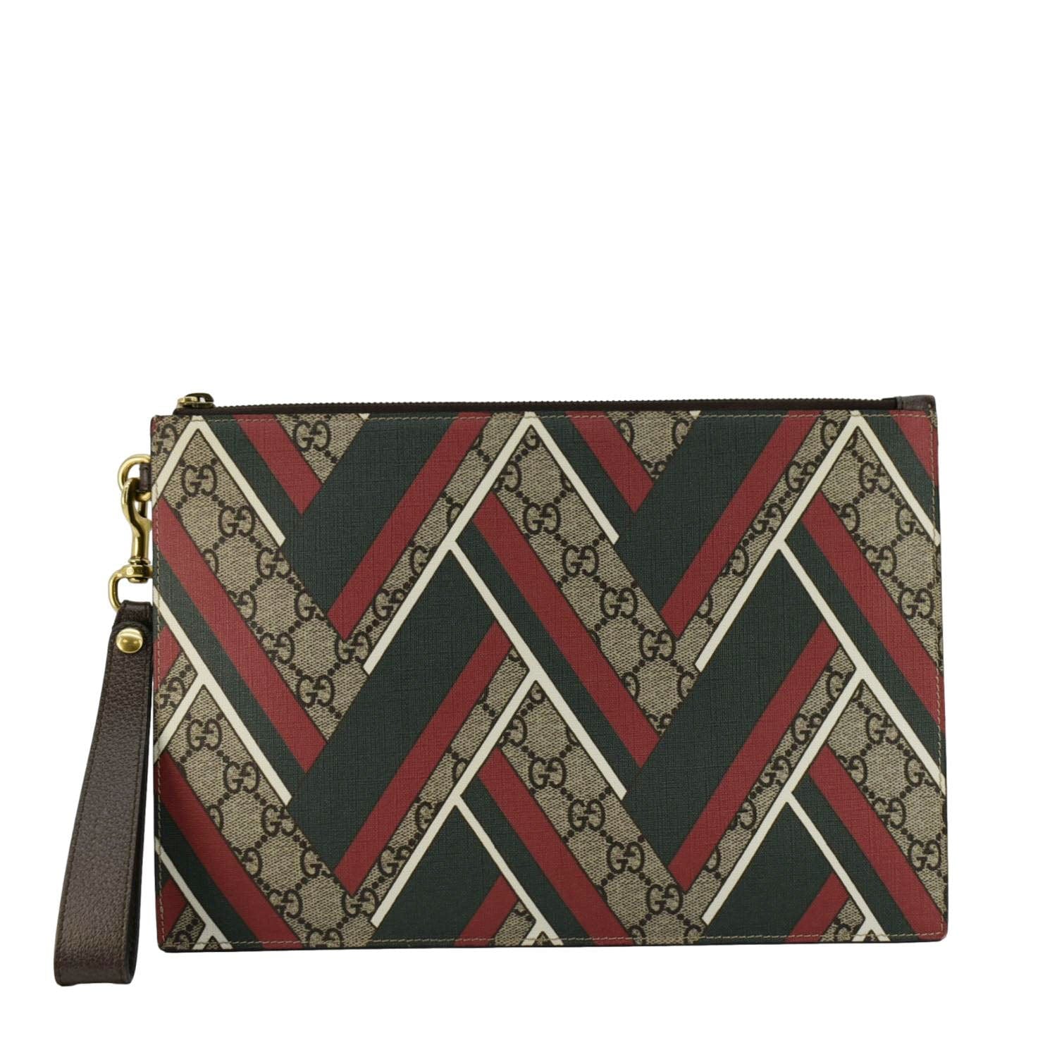 The Gucci Zipped Medium GG Pouch in beige canvas features the iconic GG print, offering a timeless and refined look. Its slim design and secure zip closure make it a stylish and practical accessory for organizing essentials.