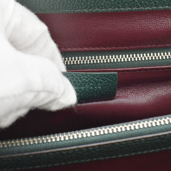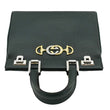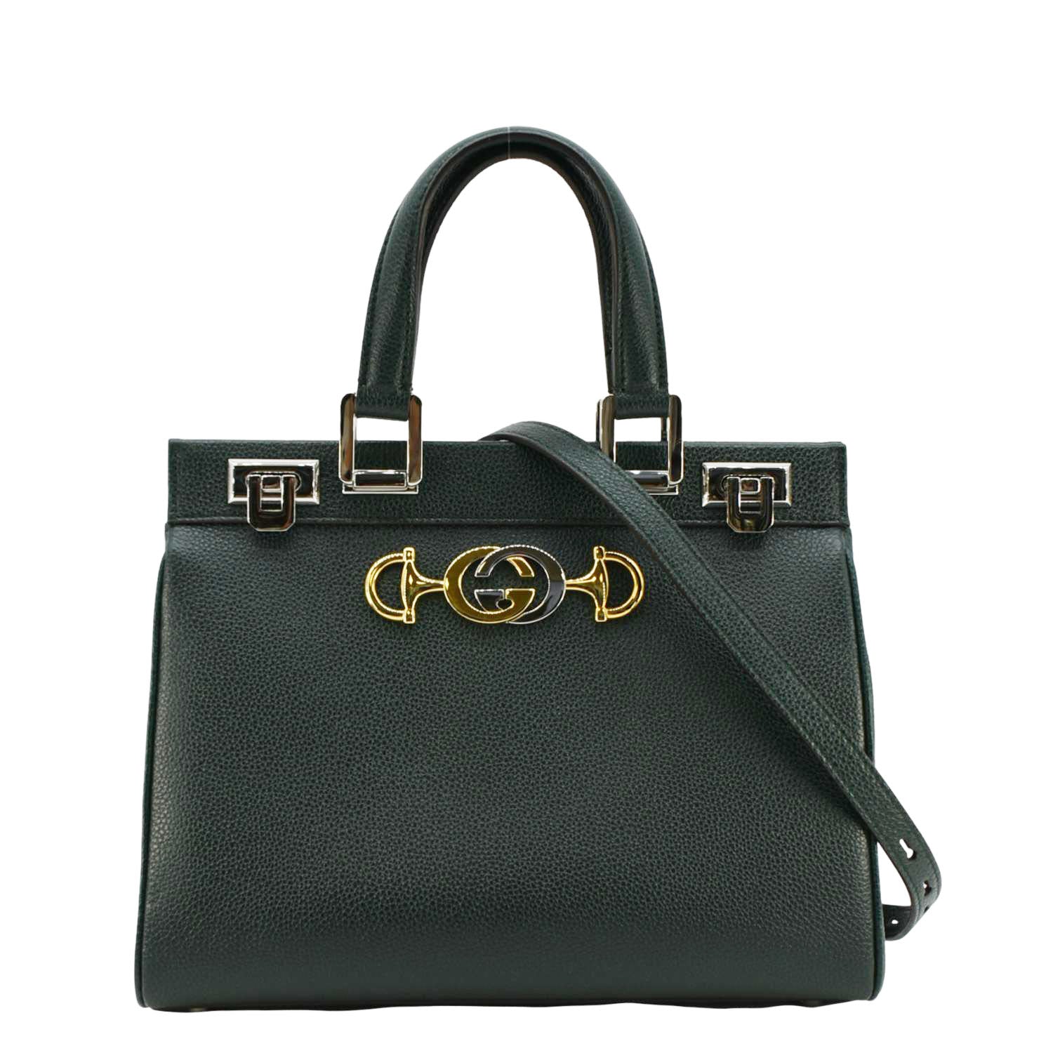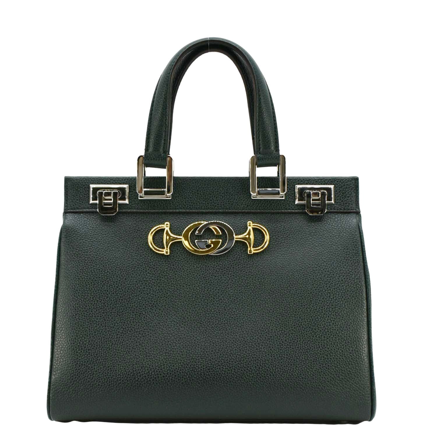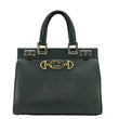 The GUCCI Zumi Small Top Handle Bag in green leather exudes sophistication with its sleek silhouette and iconic interlocking GG and horse bit hardware. Its versatile design includes both top handles and a shoulder strap for easy carrying options.