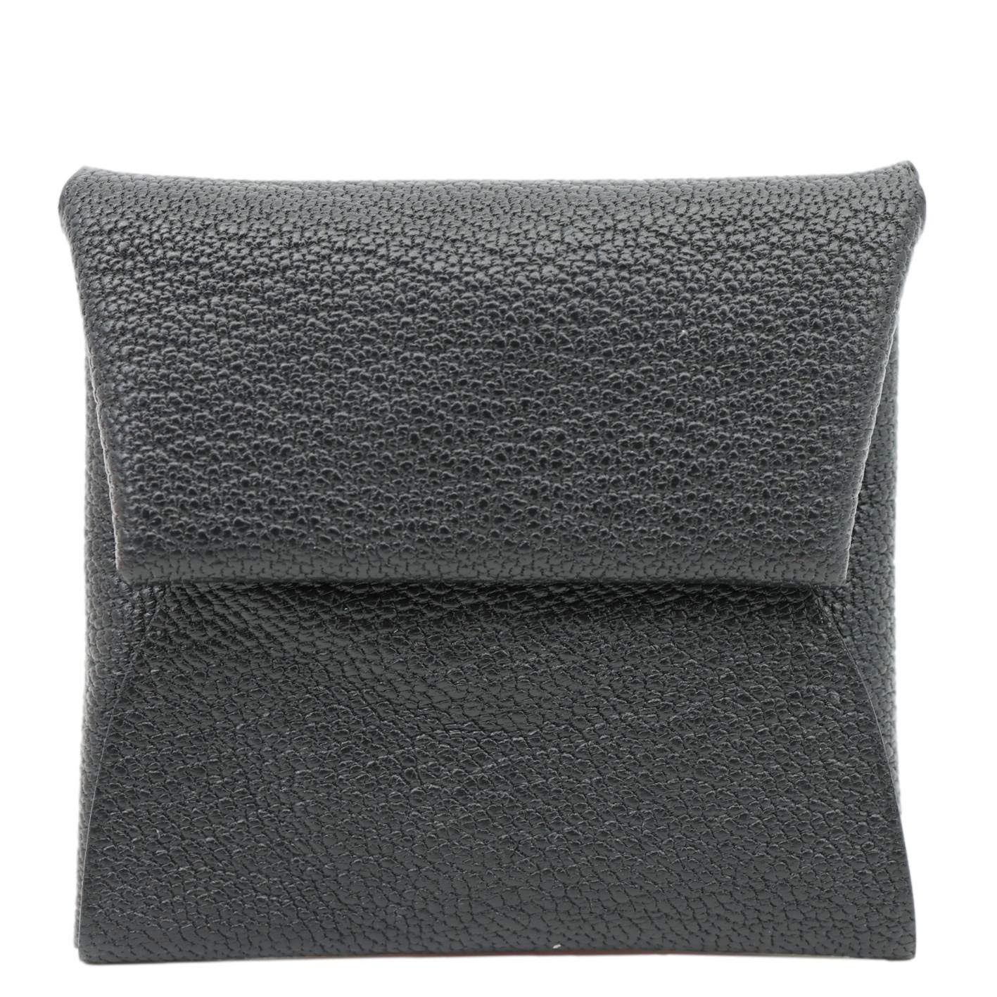 Sleek black leather coin purse from HERMES, crafted from grained goatskin and featuring the Bastia design, perfect for carrying small change in style.