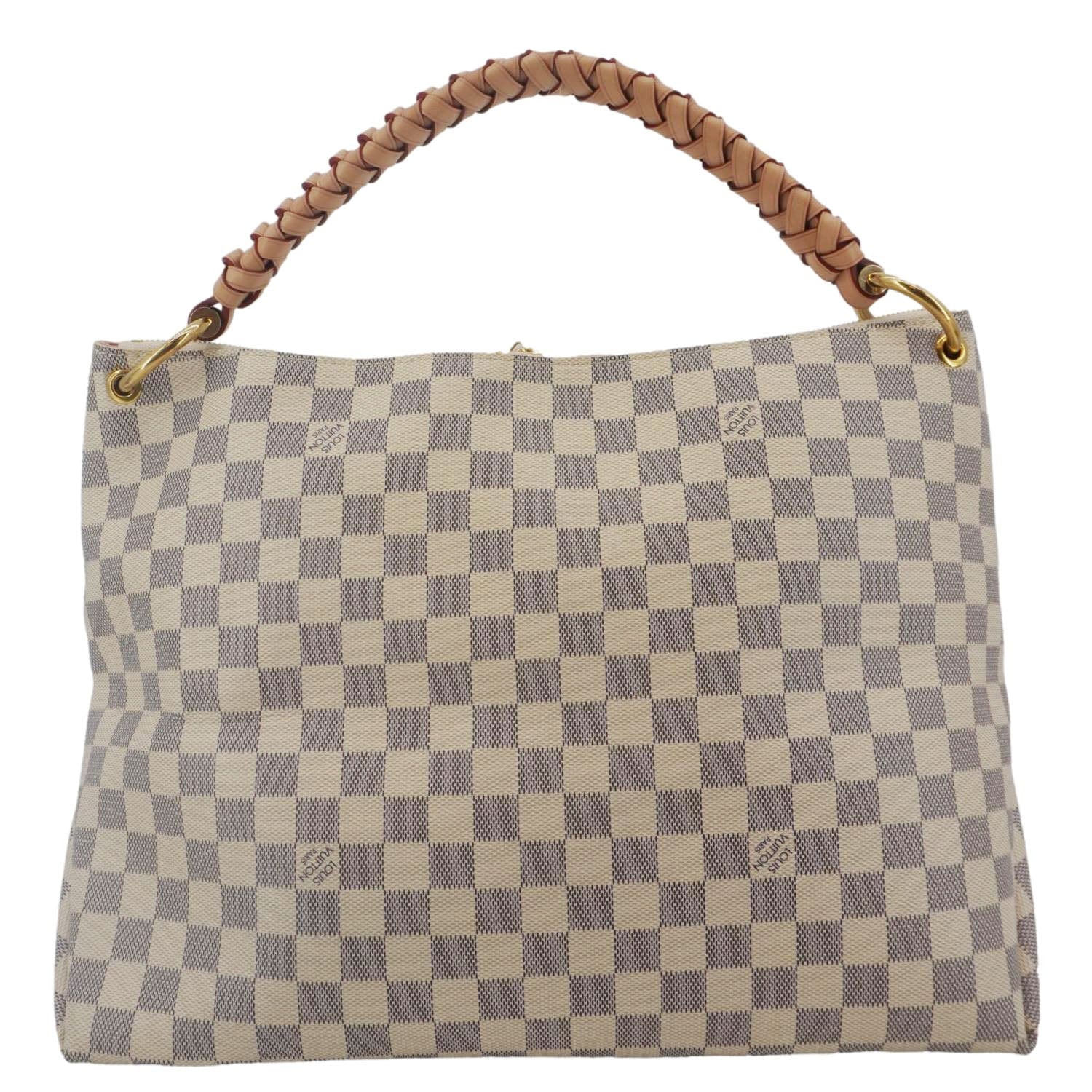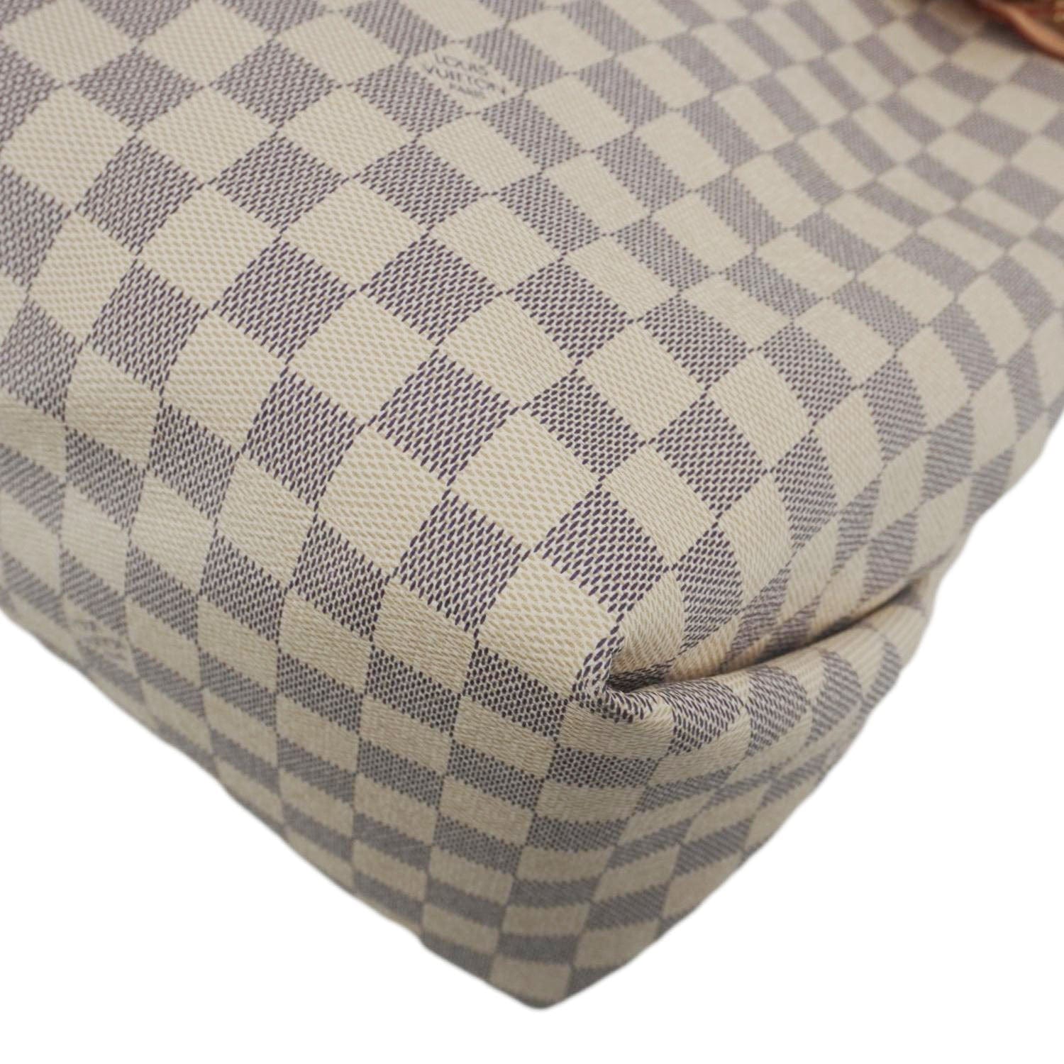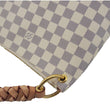 The Louis Vuitton Beaubourg MM shoulder bag in white Damier Azur canvas features a spacious design, braided leather top handles, and gold-tone hardware. A chic and functional choice for everyday elegance.