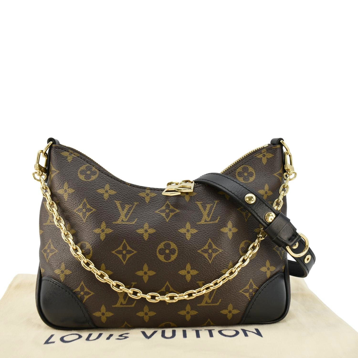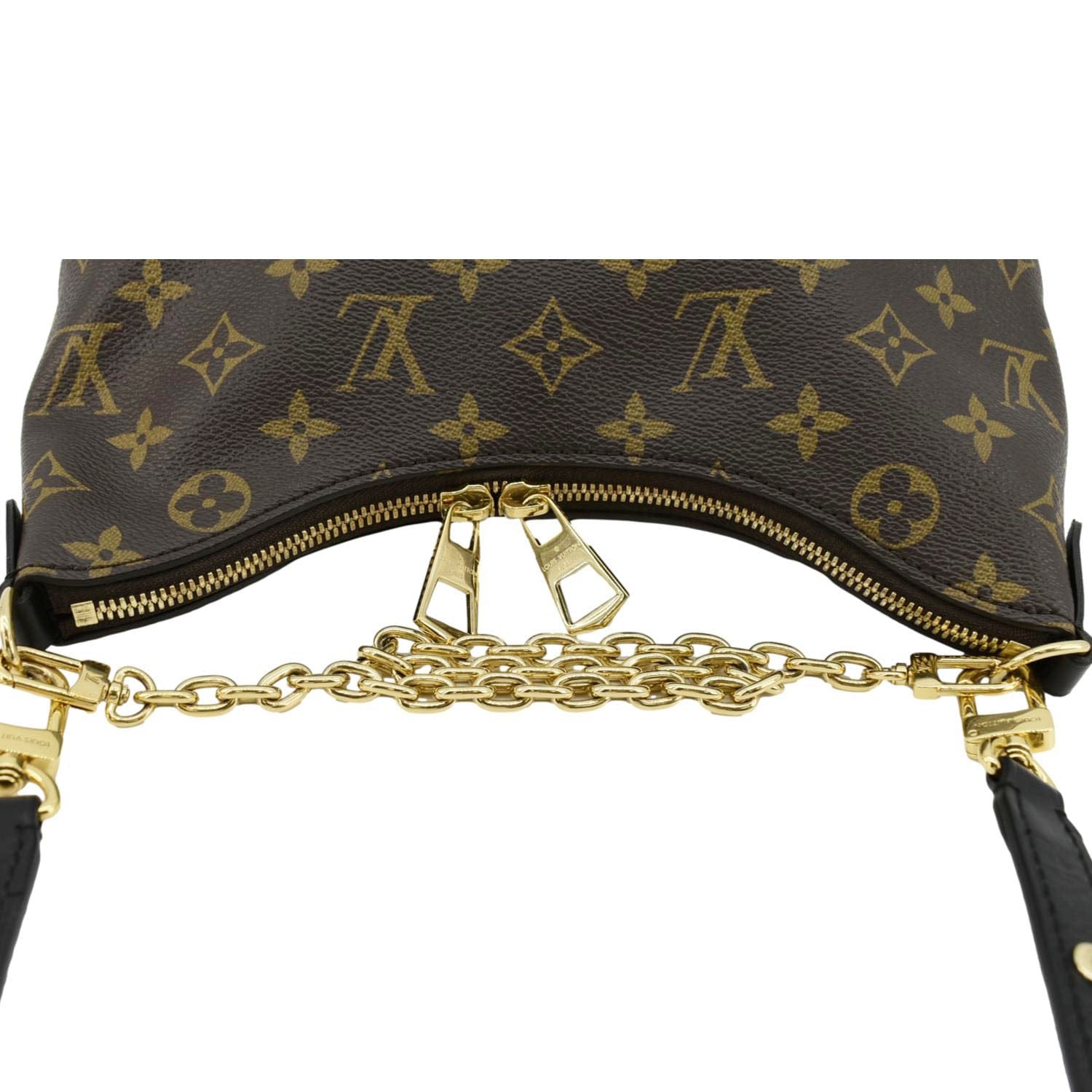The LOUIS VUITTON Boulogne Shoulder Bag in Monogram Canvas features the brand's iconic pattern in rich brown tones. Its sleek, curved design and adjustable strap make it a versatile and timeless accessory for everyday elegance.