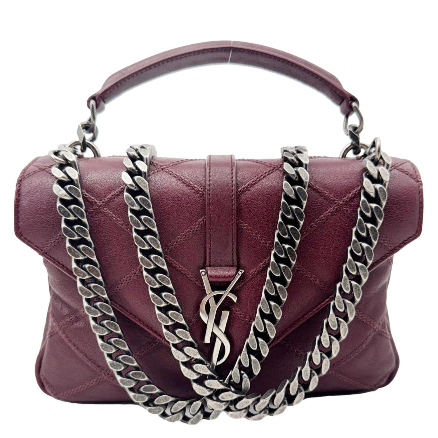 The YVES SAINT LAURENT College Medium Bag in Bordeaux showcases luxurious diamond-quilted leather with antique gold-tone hardware. Finished with the iconic YSL monogram and a top handle, it's a bold yet elegant statement piece.