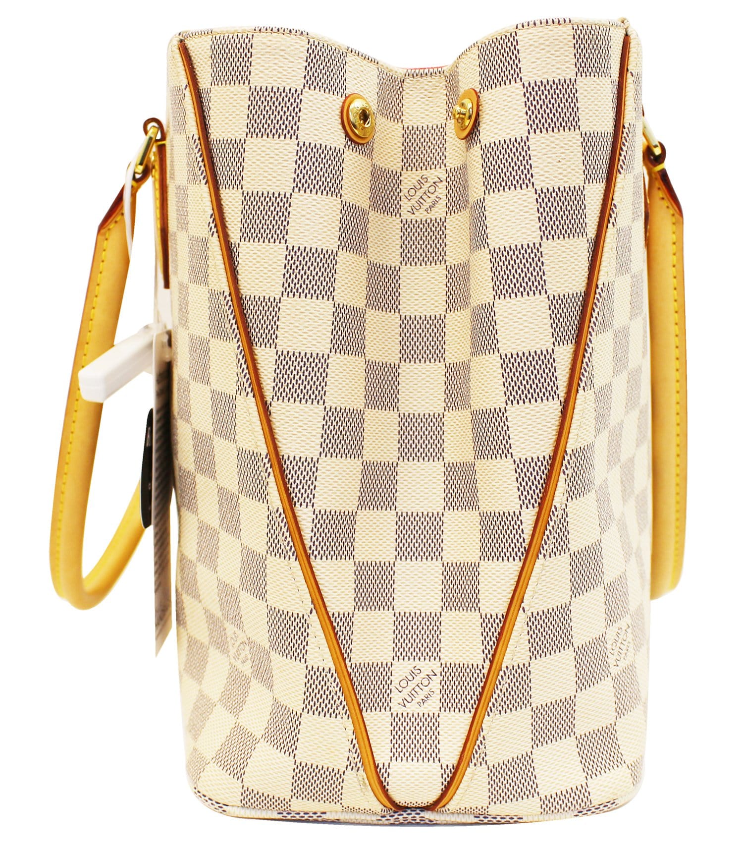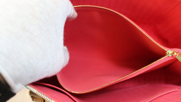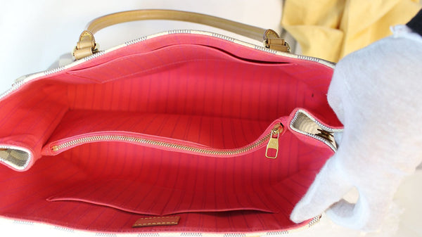 This Louis Vuitton Damier Azur Canvas Calvi Bag has fashion and functionality all rolled into one. With its expandable sides and roomy capacity, it will hold all your daily essentials in style. It also features pretty pink with purple stripes lining.