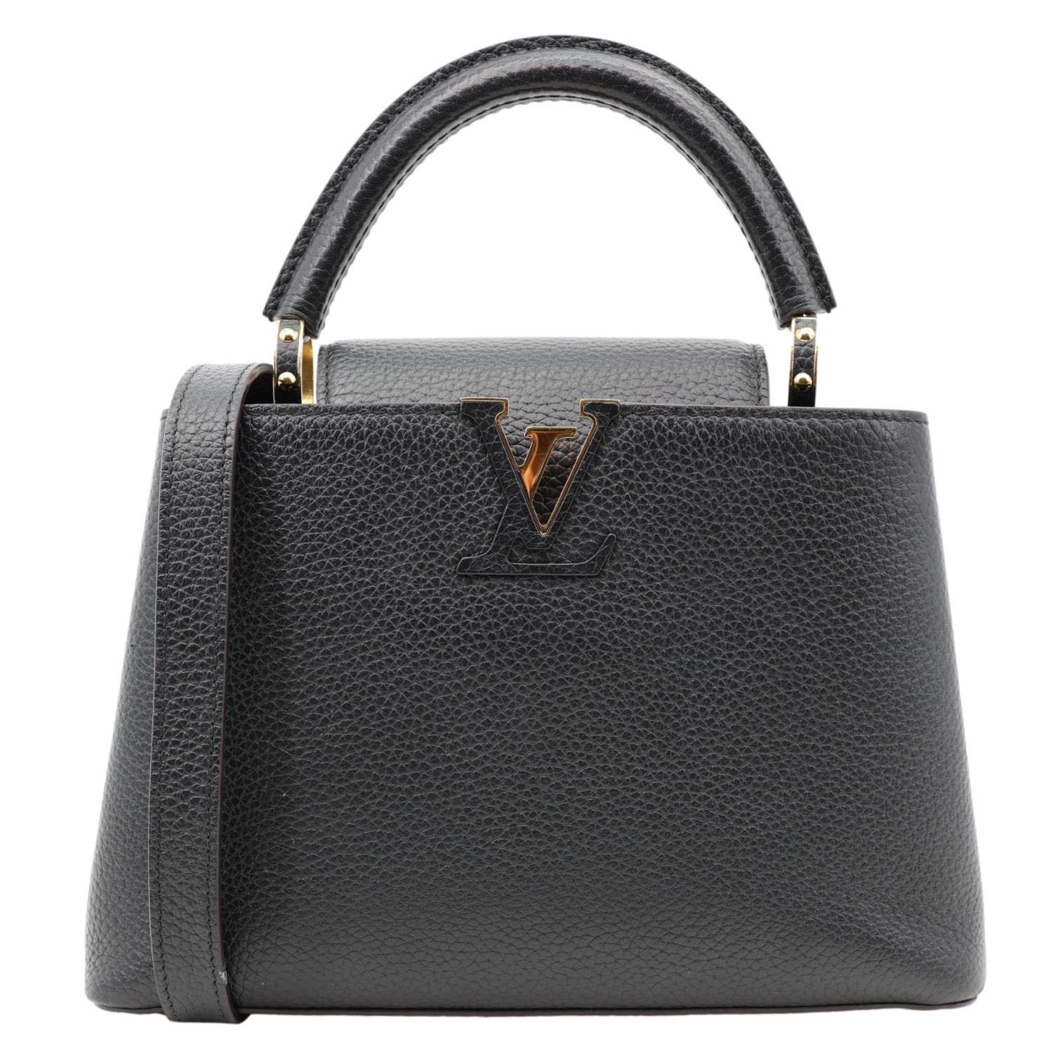 Elegant and refined, the Louis Vuitton Capucines BB Satchel in black Taurillon leather features a structured silhouette, gold-tone LV initials, and a top handle with a removable strap. A perfect blend of timeless craftsmanship and modern sophistication.