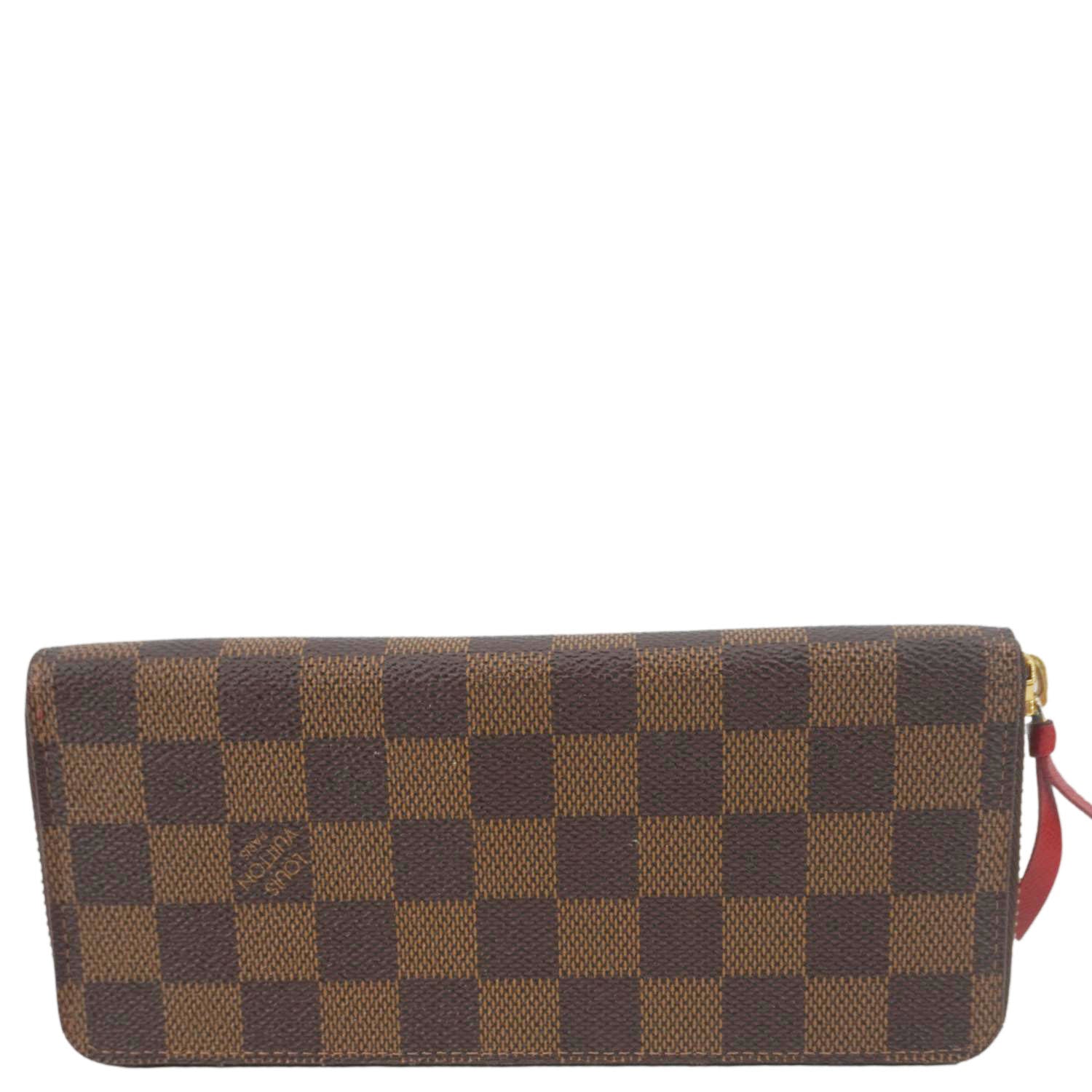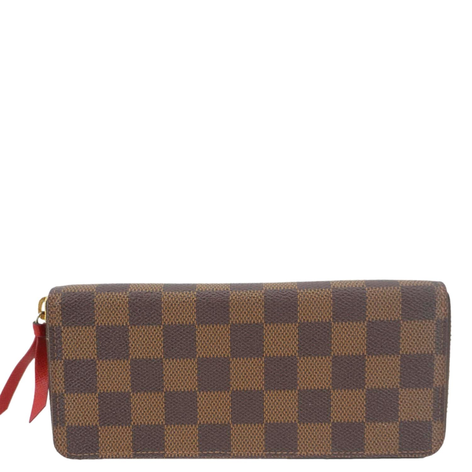 The LOUIS VUITTON Clémence Wallet in Damier Ebene canvas features a compact zip-around design with a grained leather interior. Elegant and practical, it's perfect for organizing essentials in timeless style.