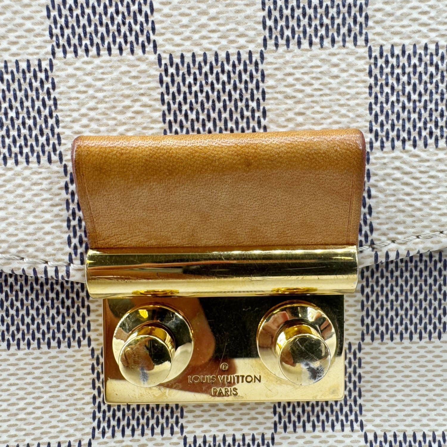 The Louis Vuitton Croisette in Damier Azur canvas with Rose Ballerine leather trim offers a fresh, summery aesthetic with its structured satchel silhouette and adjustable crossbody strap. Its compact size and iconic print make it a versatile choice for casual elegance.