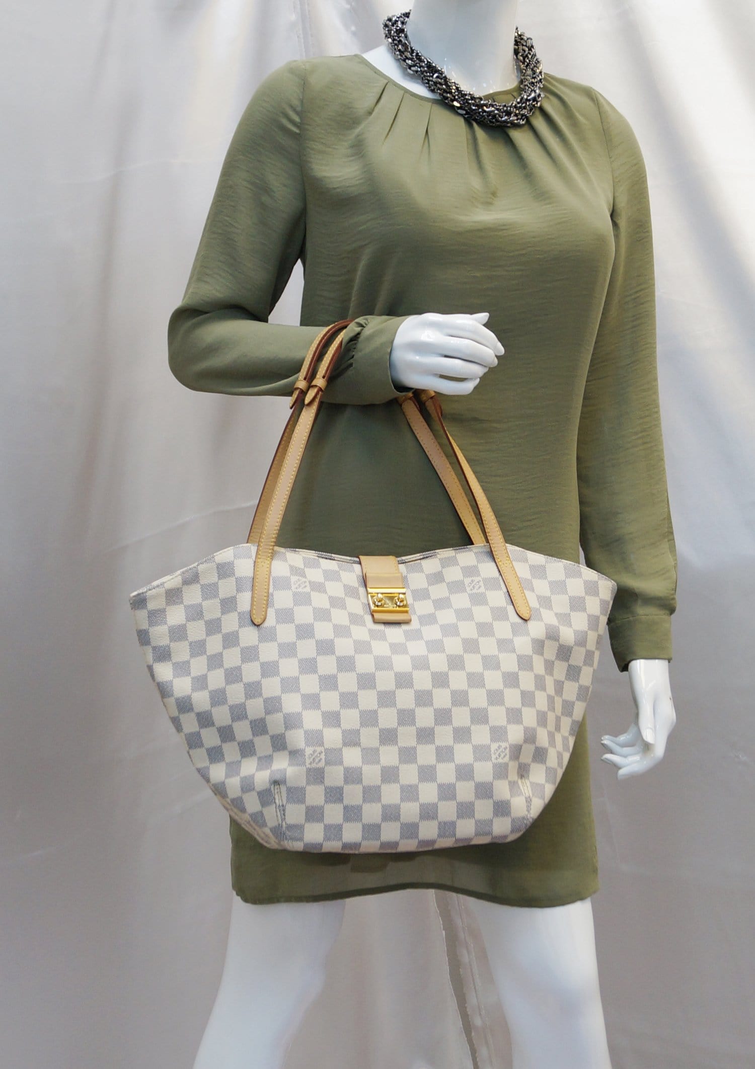 Elegant and compact, the Salina GM tote is a newer creation that is a simply delightful! Charmingly compact, the Saling features long leather flat handles and supple Damier Azur canvas that would make this a perfect bag for a weekend get away or warm summer days. The squeeze-to-open gold tone clasp was inspired by classic Louis Vuitton trunk locks.