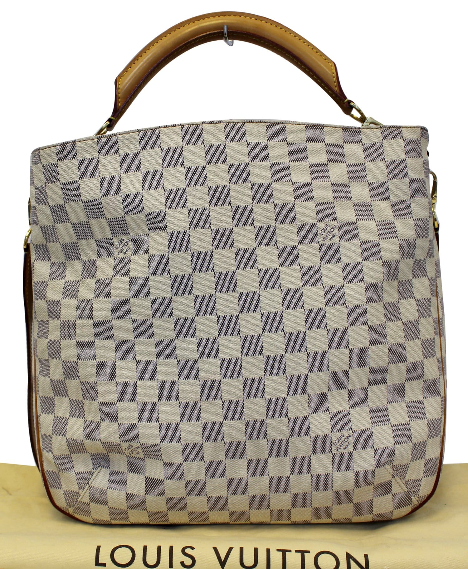 Louis Vuitton Soffi is versatile and chic in Damier Azur. It features a rolled leather shoulder strap and a long flat leather strap, both of which can be removed for a unique convertible appeal. The edges of the bag feature a three-part red edge to give this bag a sturdy shape.