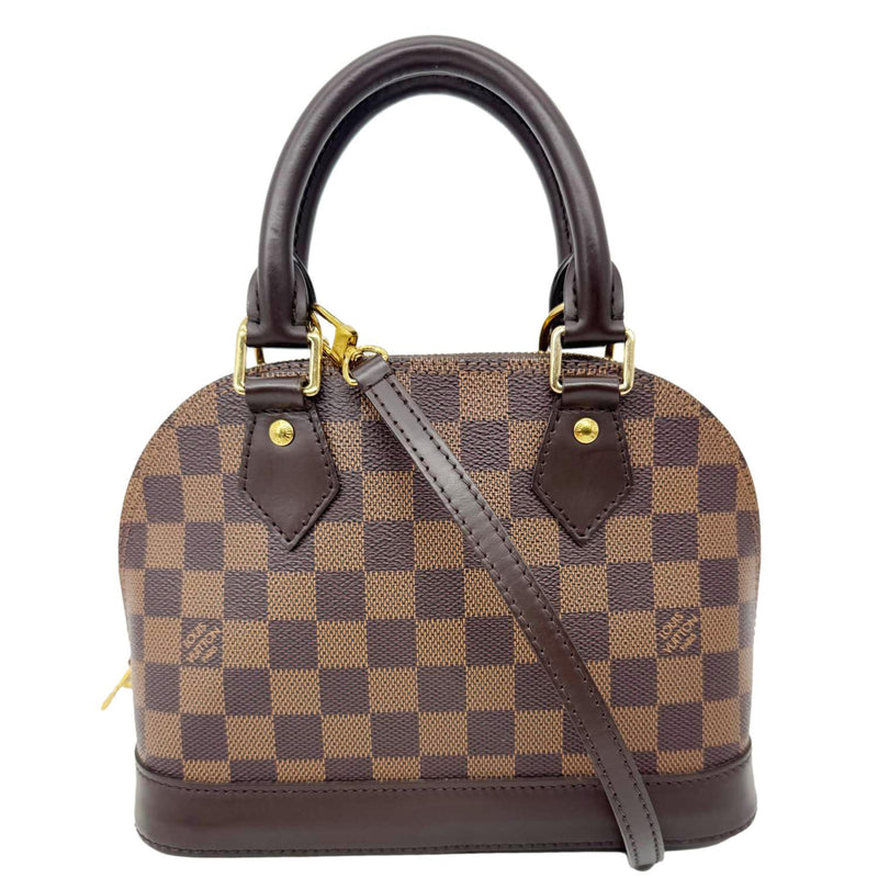 The LOUIS VUITTON Alma BB in Damier Ebene canvas is a timeless satchel with a structured silhouette and elegant brown checkered pattern. Featuring a detachable strap and gold-tone hardware, it offers versatile carry for day or evening.