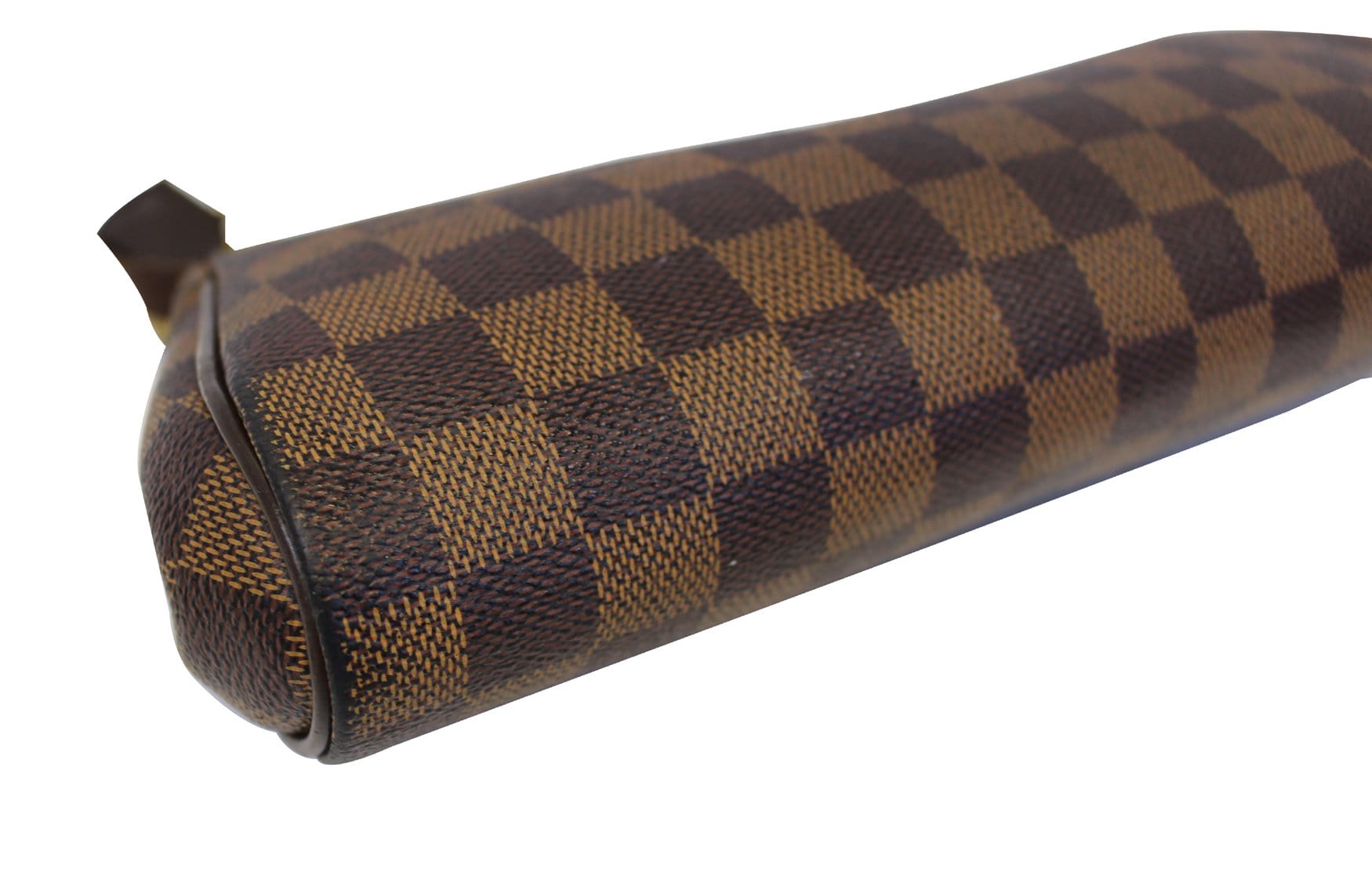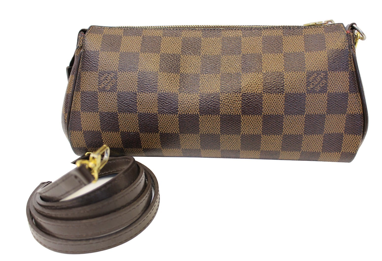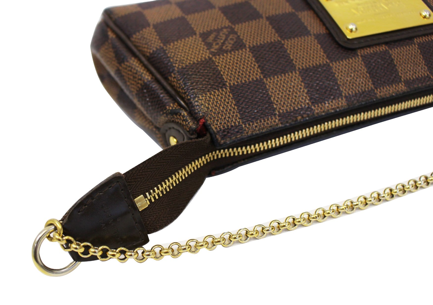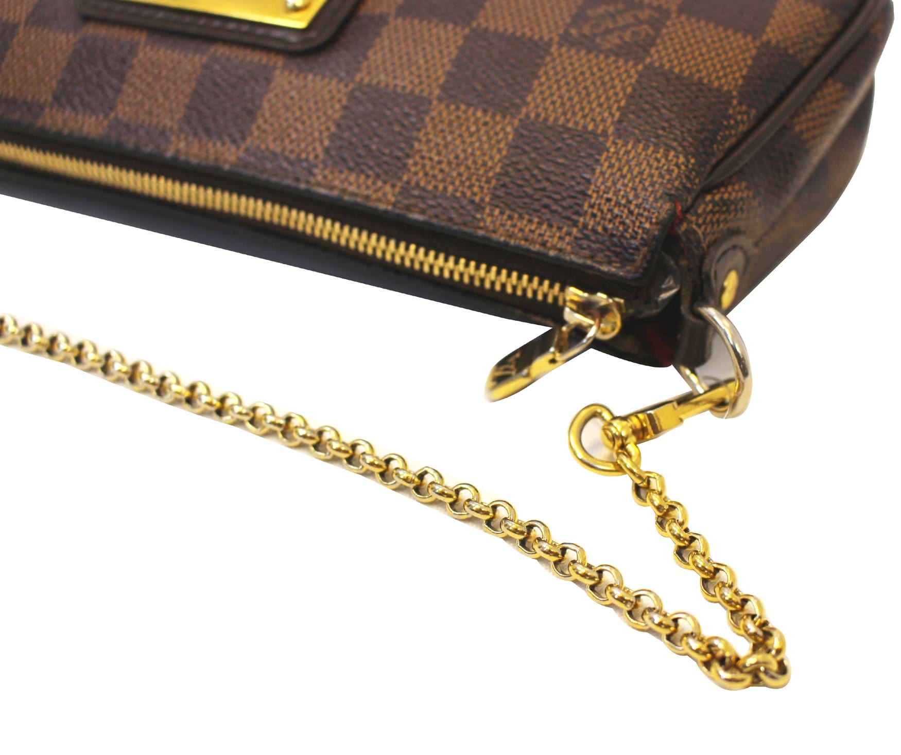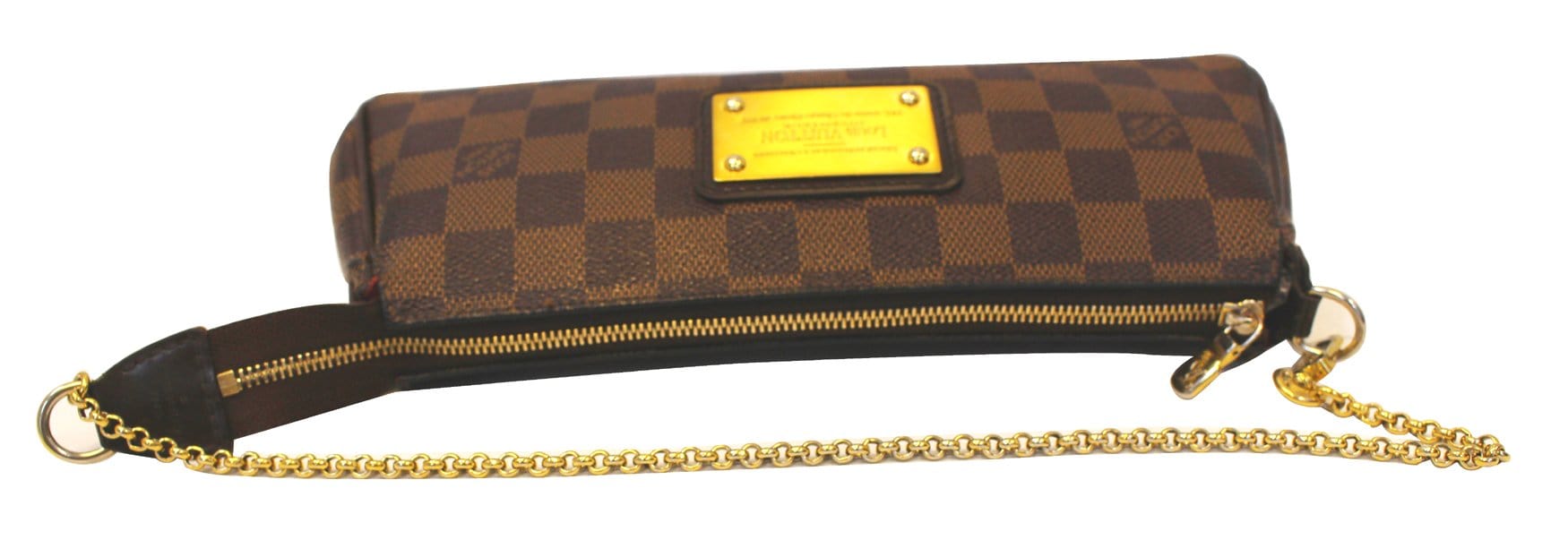Louis Vuitton Damier Canvas Eva Clutch Bag is ideal for holding your cosmetics and girly essentials in a fun and elegant manner. The versatility of the two straps makes this bag even better! The chain can be converted to a wrist strap. Please note this is missing the long strap. Whatever you're mood is for the night, this bag is the perfect accessory.