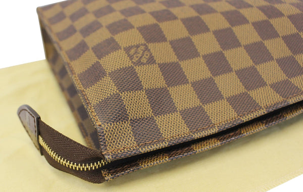 Louis Vuitton Damier Ebene Poche Toilette 25 is the perfect solution for carrying your cosmetics in style. It features a washable textile lining and gusseted sides that expand. You won't want to leave home without this classic and elegant piece.