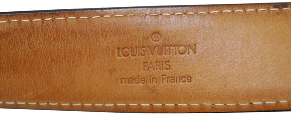 This stylish belt is crafted of vachetta cowhide leather with an external layer of Louis Vuitton damier check canvas. The belt features a classic polished brass buckle engraved with the Louis Vuitton logo