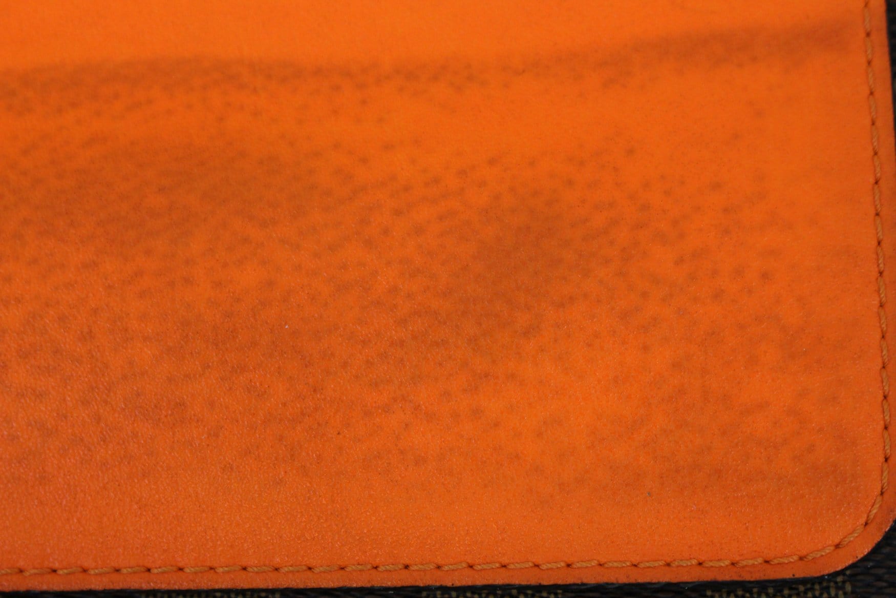 Visible Scratches, rubbed corners, leather tanning darkening. inside stains
