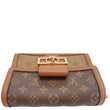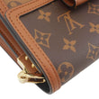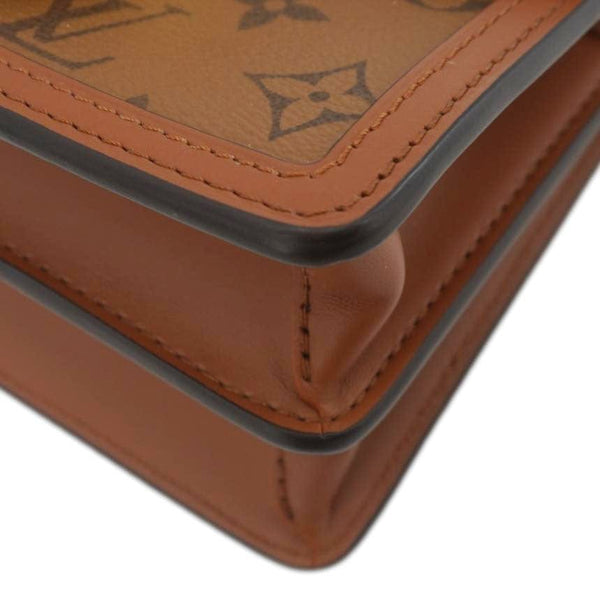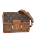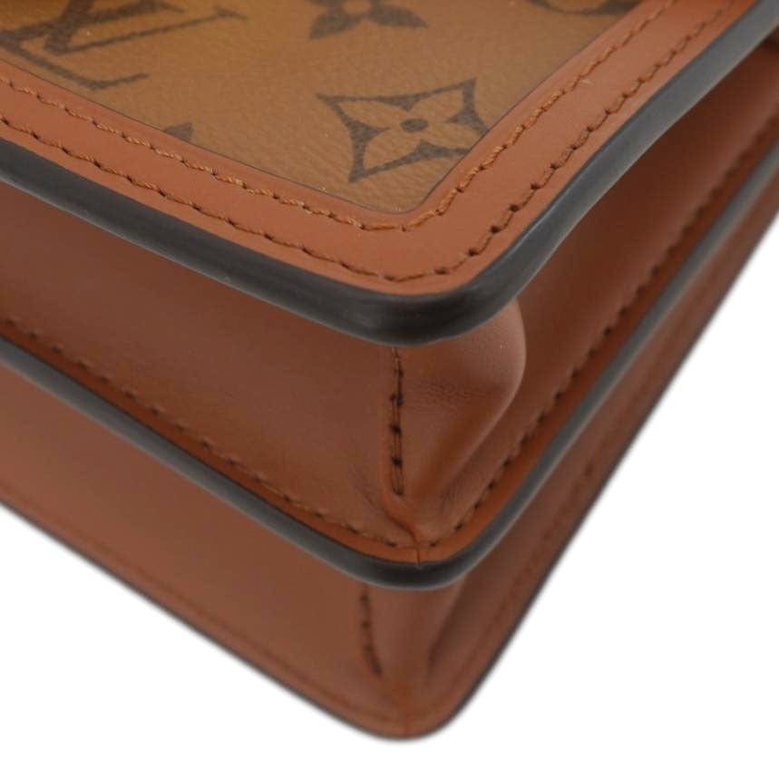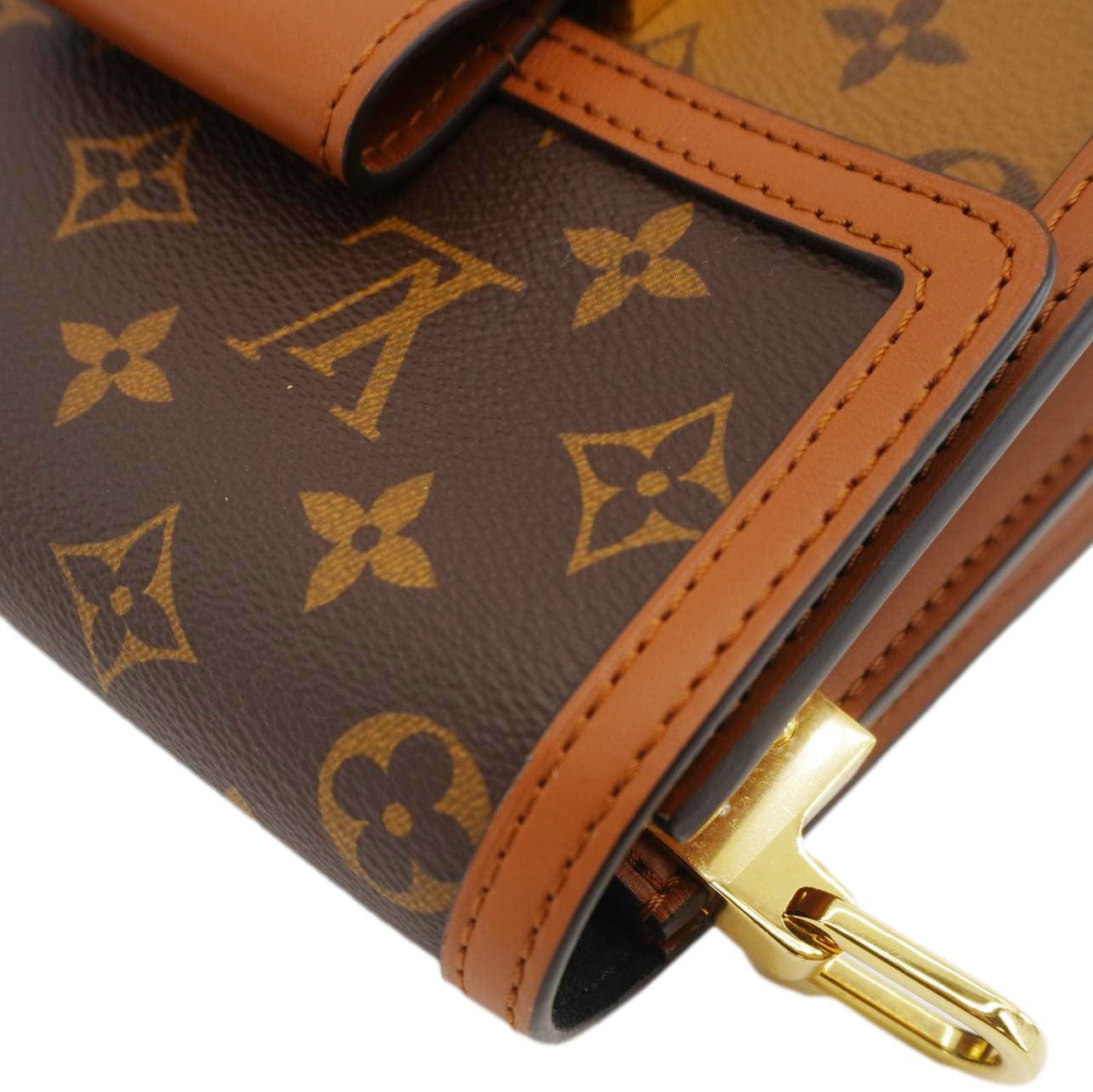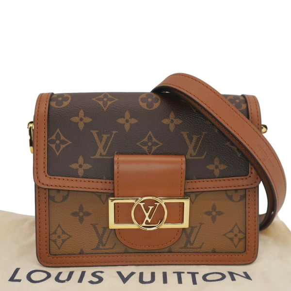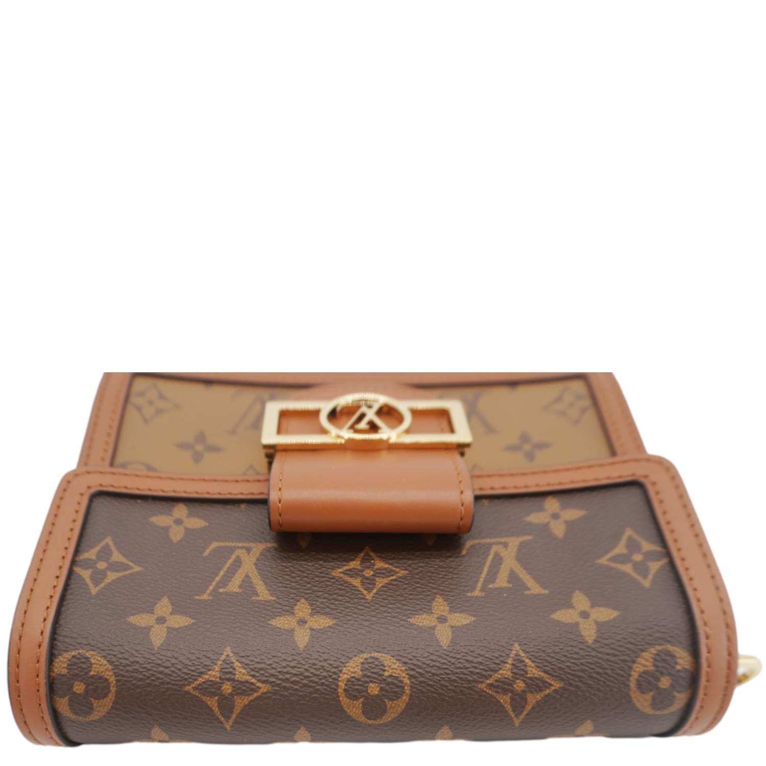 The Louis Vuitton Dauphine Mini Shoulder Bag in Monogram Reverse canvas features a compact design with a mix of classic and reverse monogram patterns. Its gold-tone LV magnetic clasp and adjustable strap add a modern touch to this timeless piece.