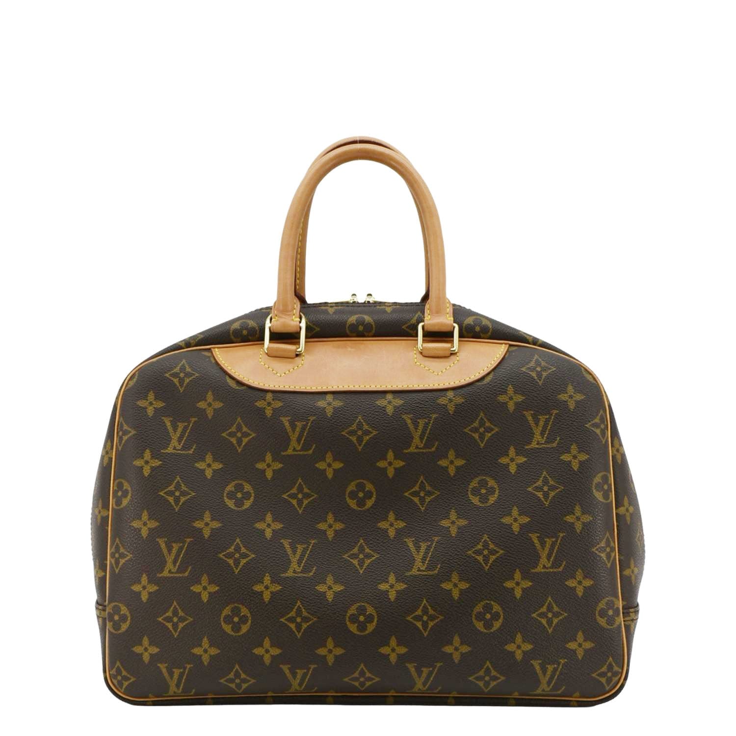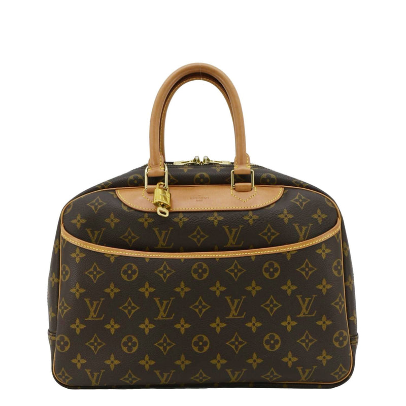 The Louis Vuitton Deauville Monogram Canvas Satchel Bag in brown features the iconic monogram canvas with natural leather trim. It has a structured design, multiple interior compartments, and double handles, ideal for organized travel or daily use.