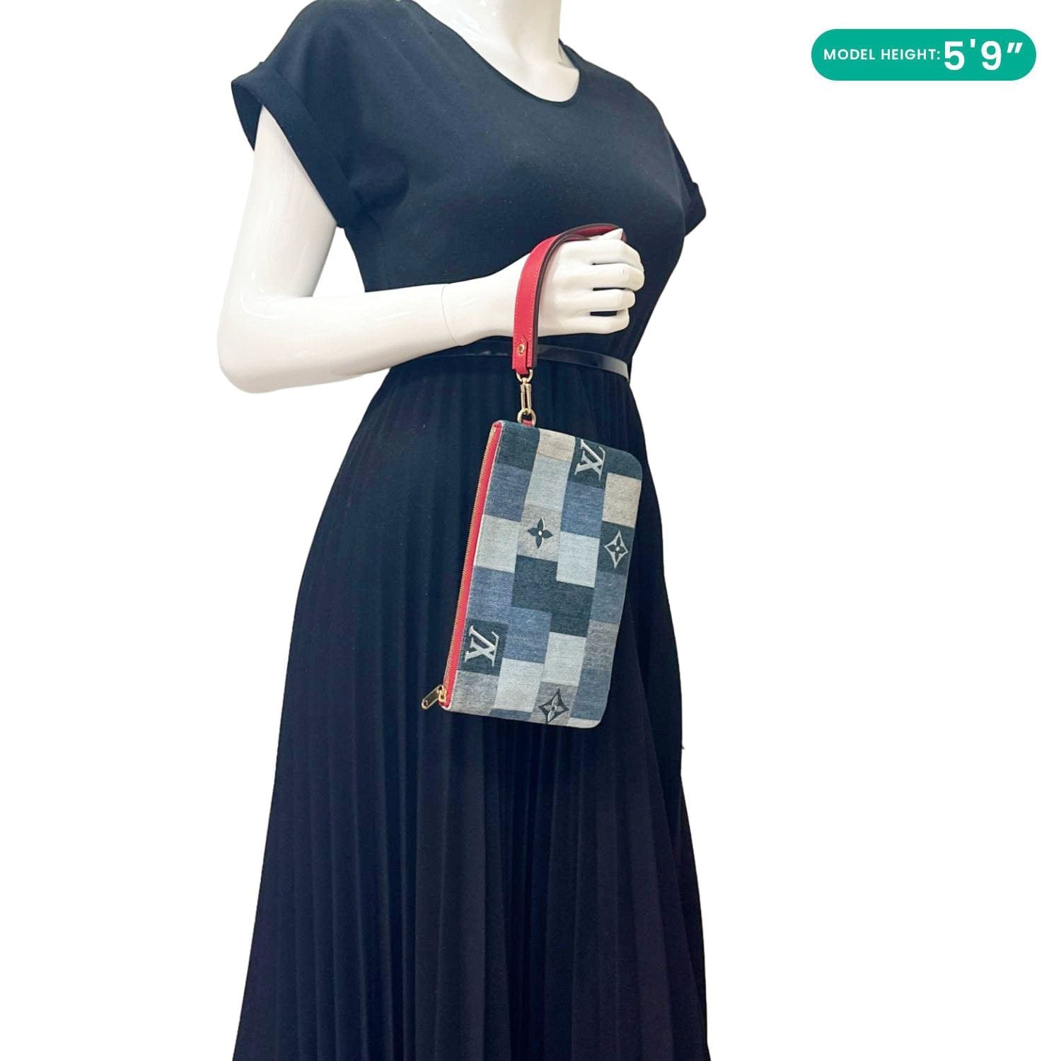 The Louis Vuitton City Denim Wristlet Pouch in Blue Rouge features casual denim canvas accented with vibrant red leather trim. Compact and stylish, it’s perfect for carrying essentials with a chic, relaxed vibe.