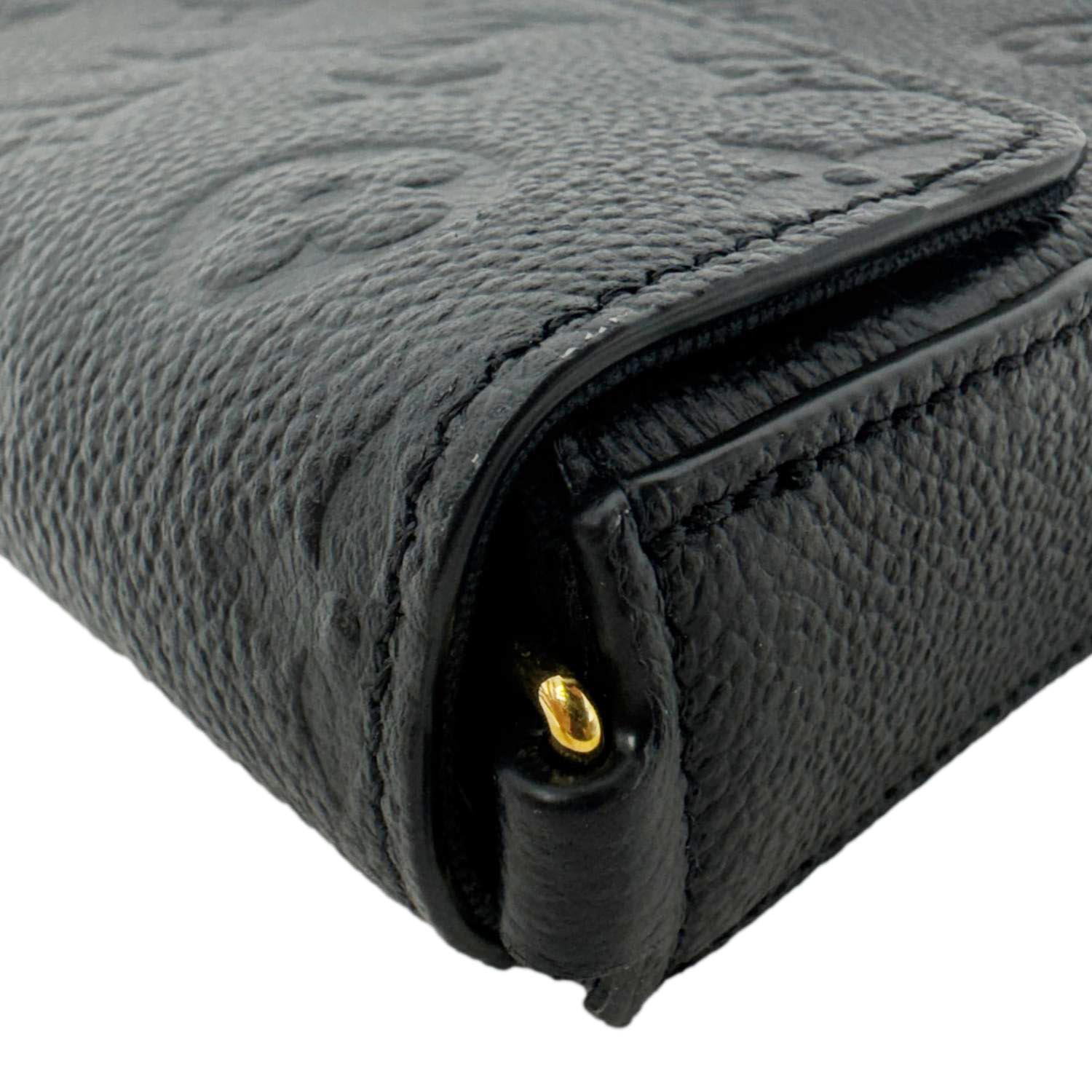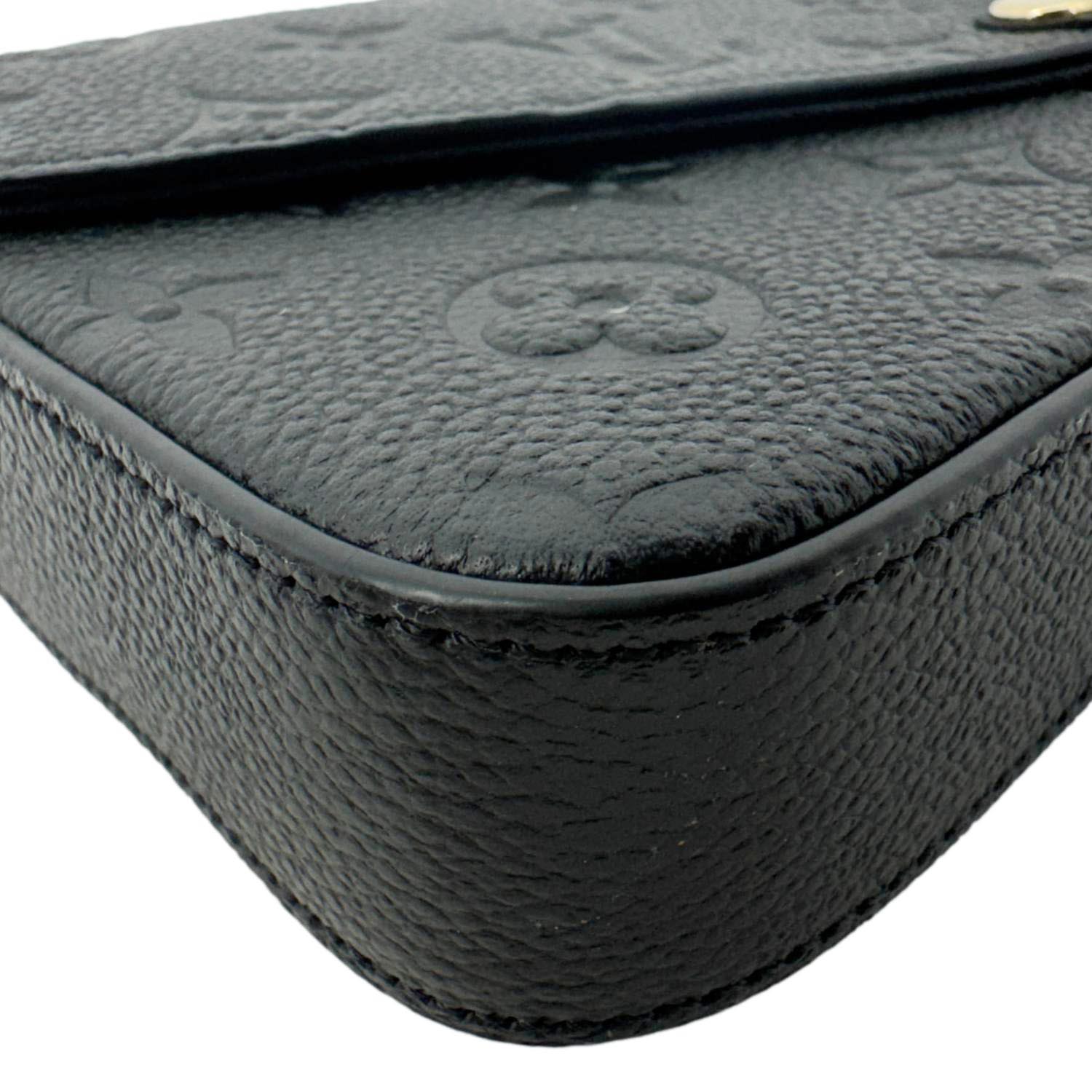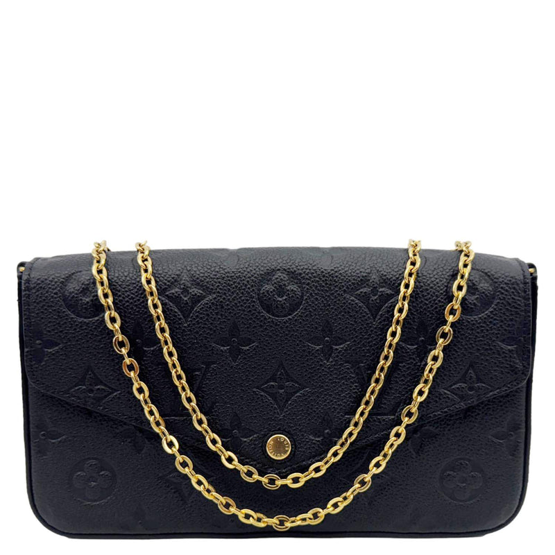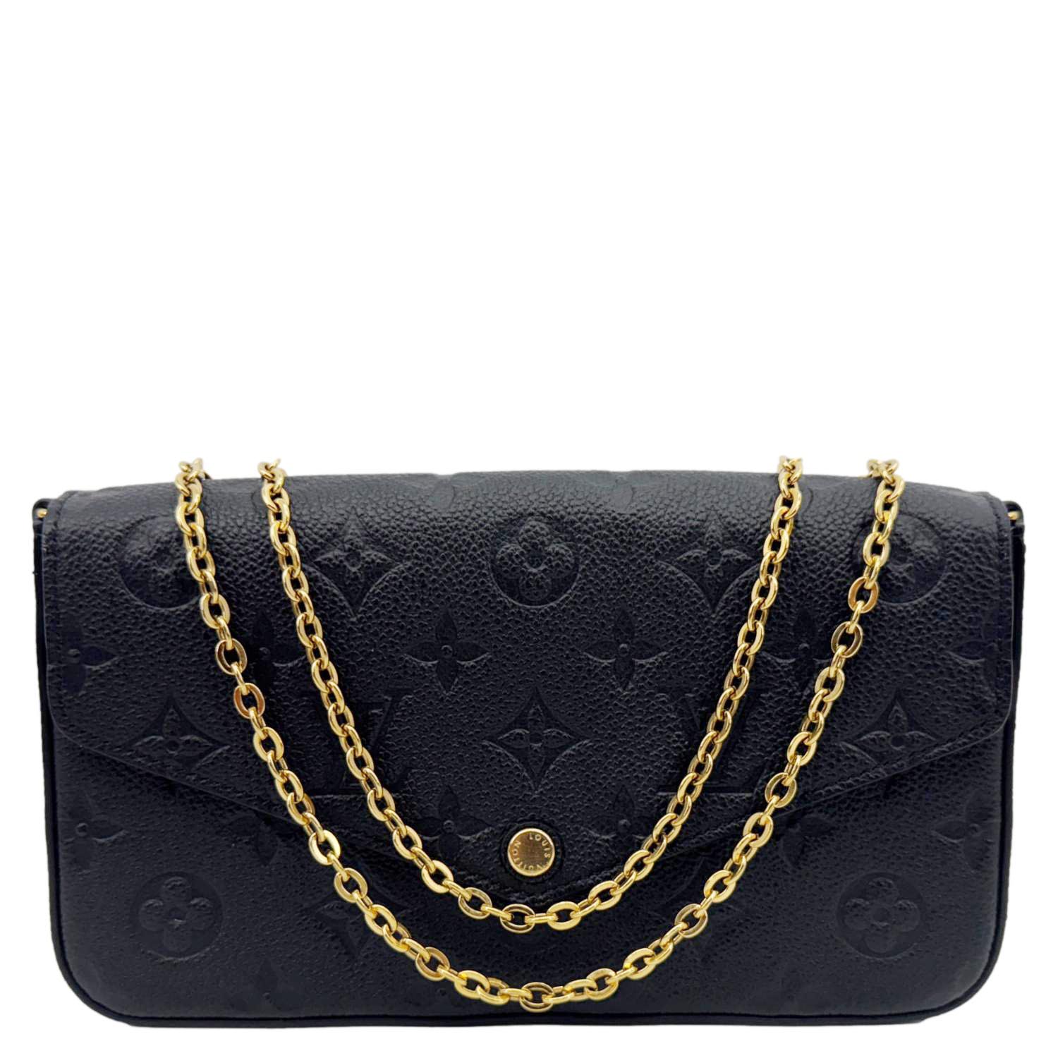 LOUIS VUITTON Felicie Pochette Monogram Empreinte Crossbody Bag in Black features embossed monogram leather with gold-tone hardware. This versatile and compact bag includes removable inserts and a chain strap for day-to-night elegance.
