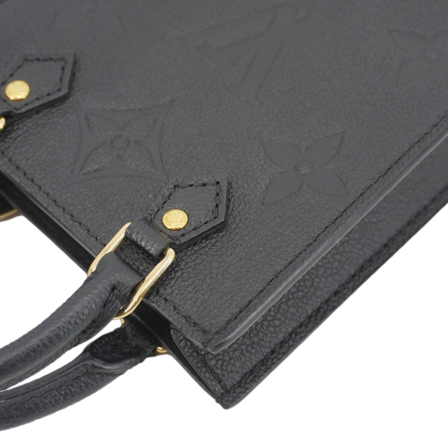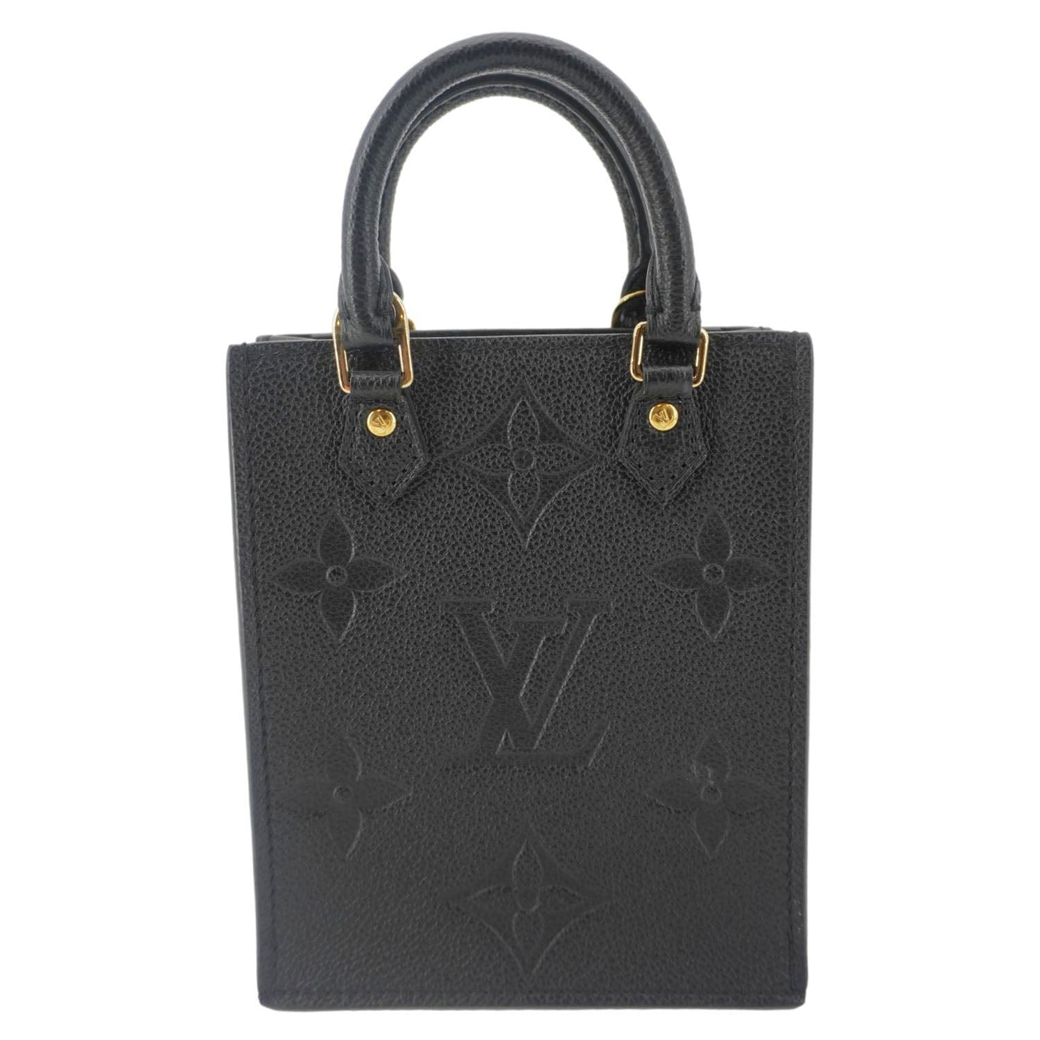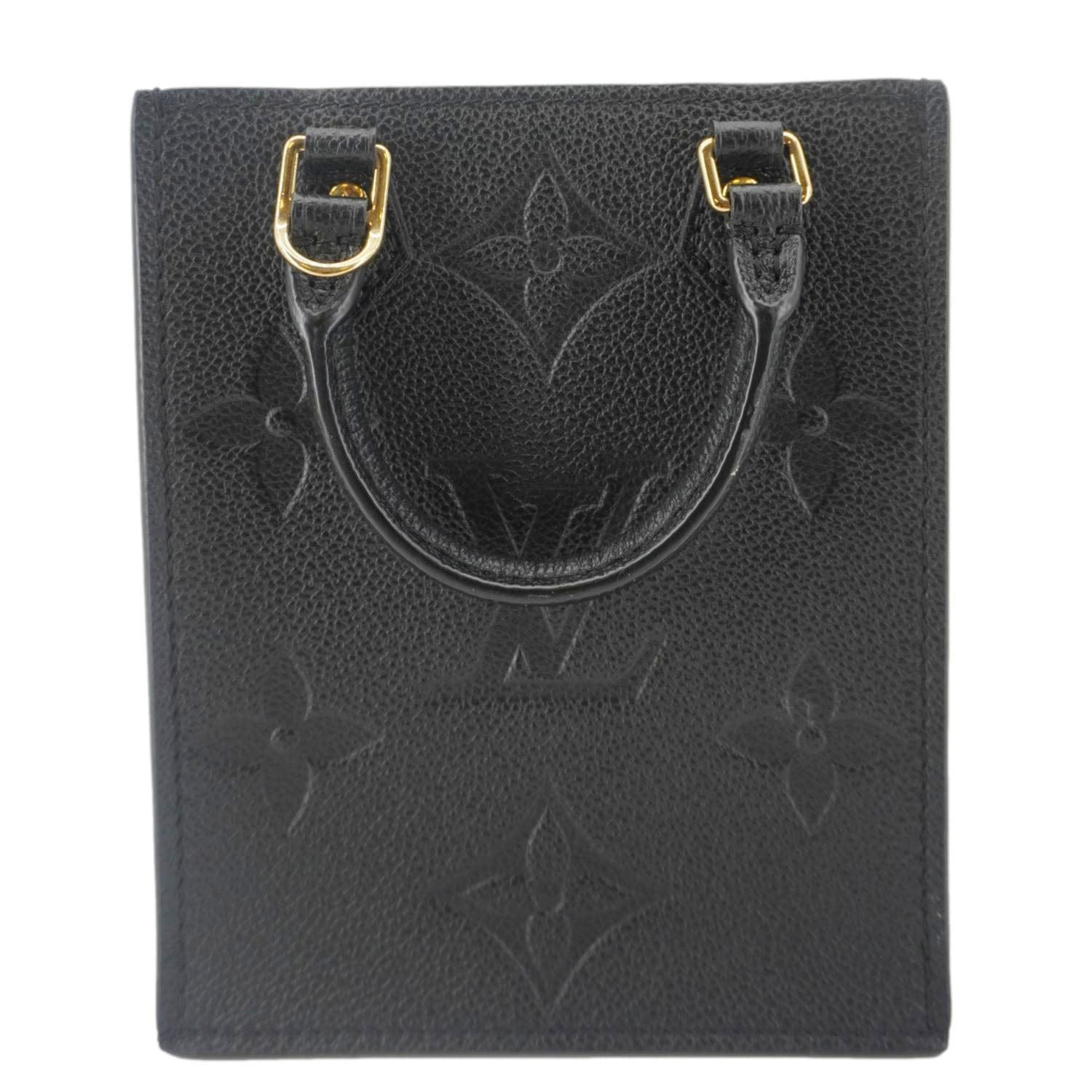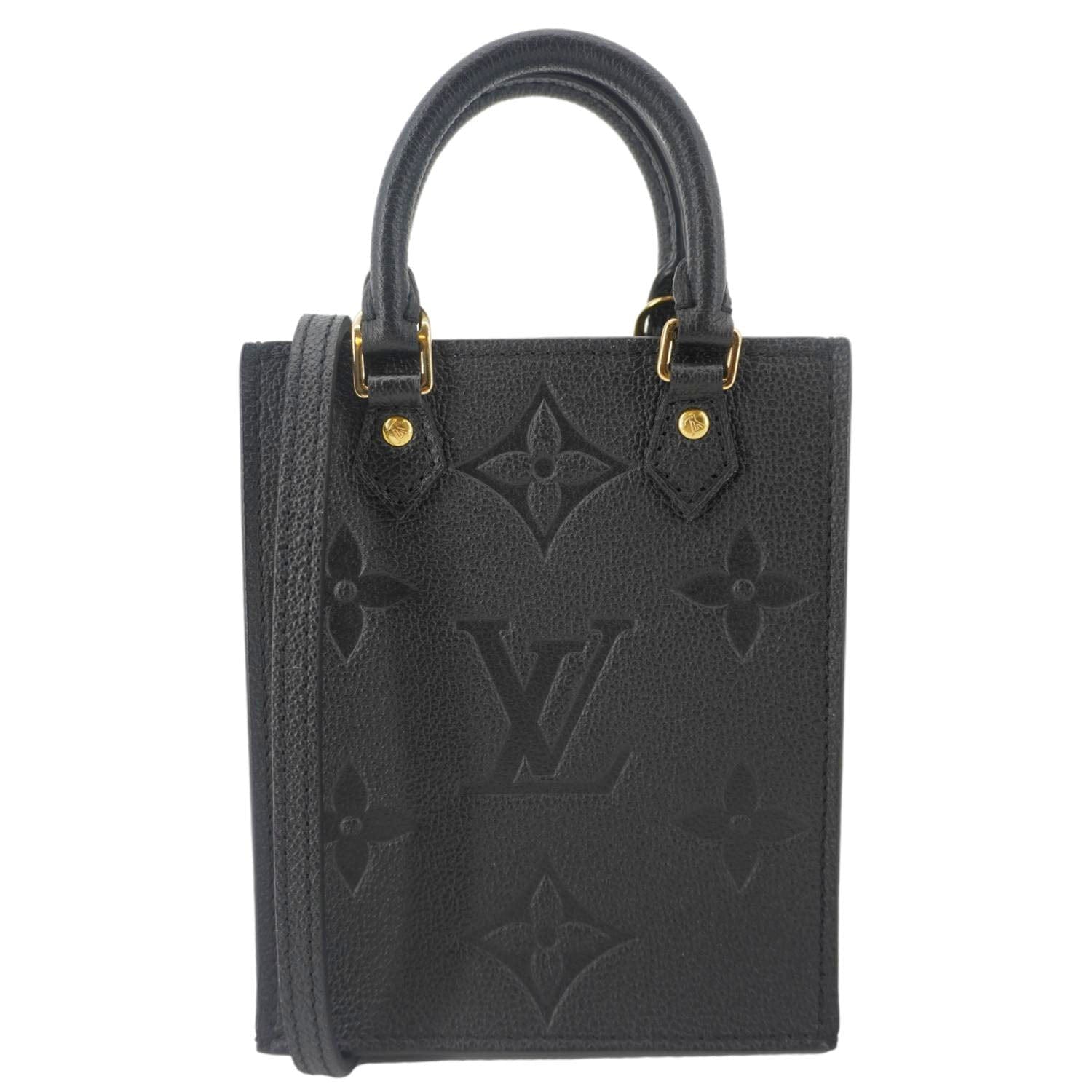 The Louis Vuitton Petit Sac Plat in Black Monogram Empreinte Leather features a compact yet structured design, embossed monogram detailing, and a removable strap for versatile carrying options.