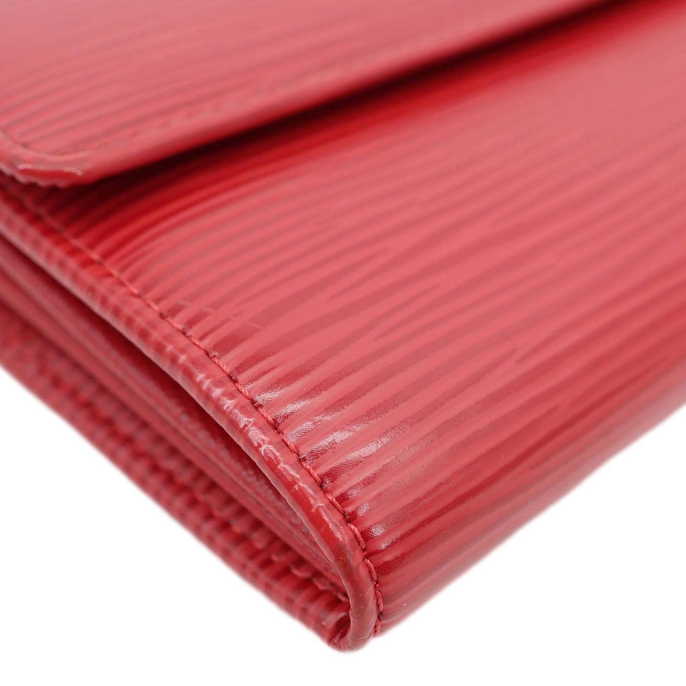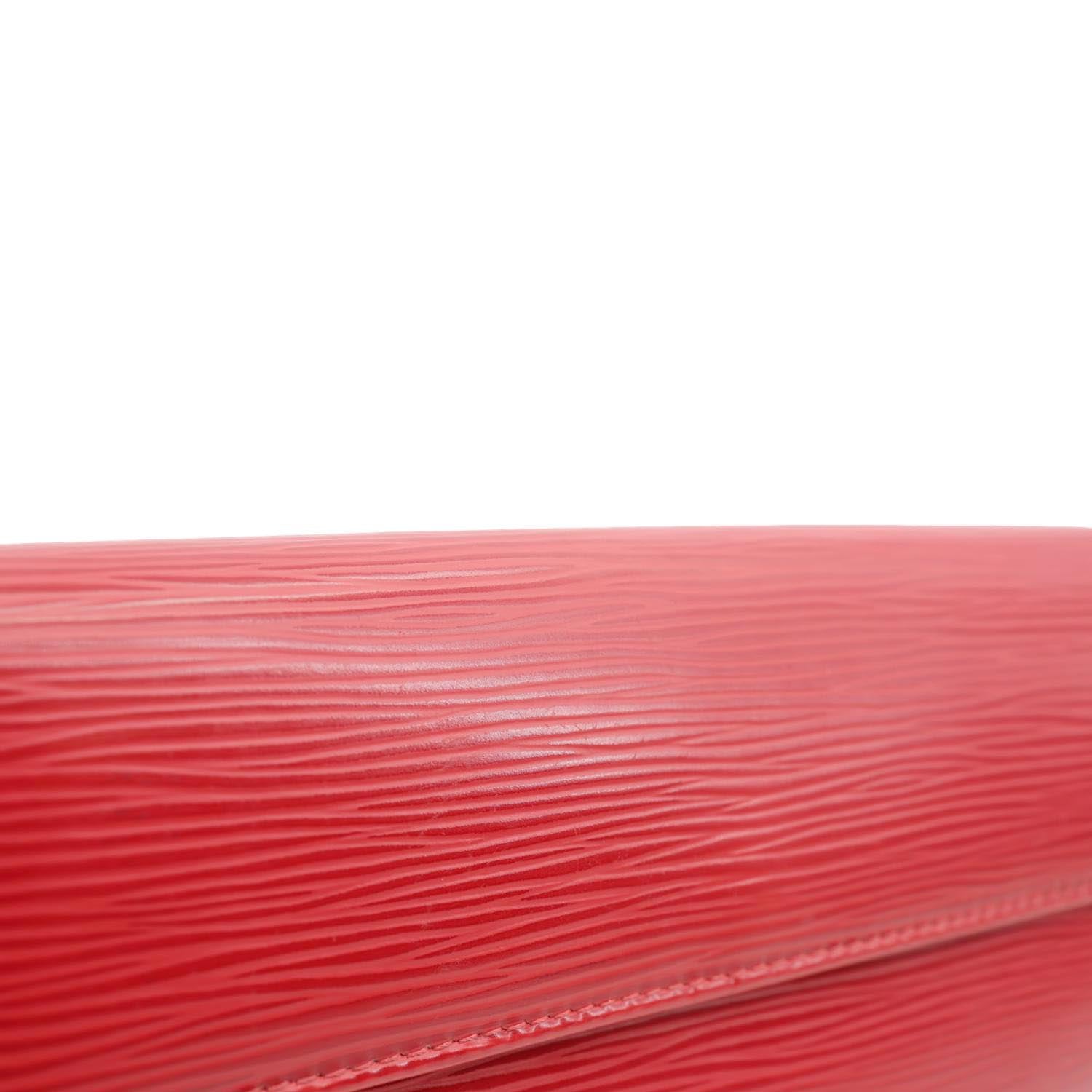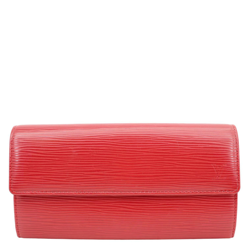 LOUIS VUITTON Sarah Wallet in Epi Leather showcases a striking red finish with a sleek, textured design. Spacious and elegant, it offers organized compartments for everyday essentials.