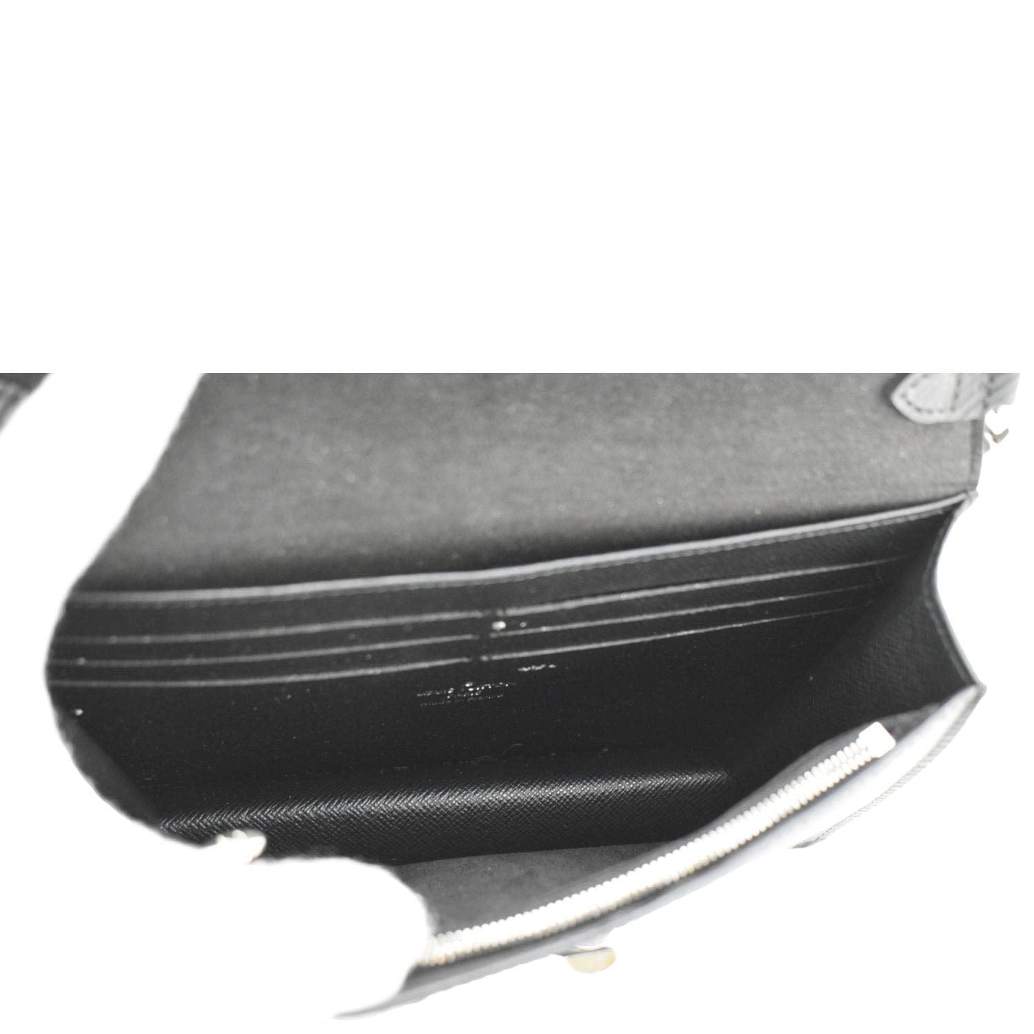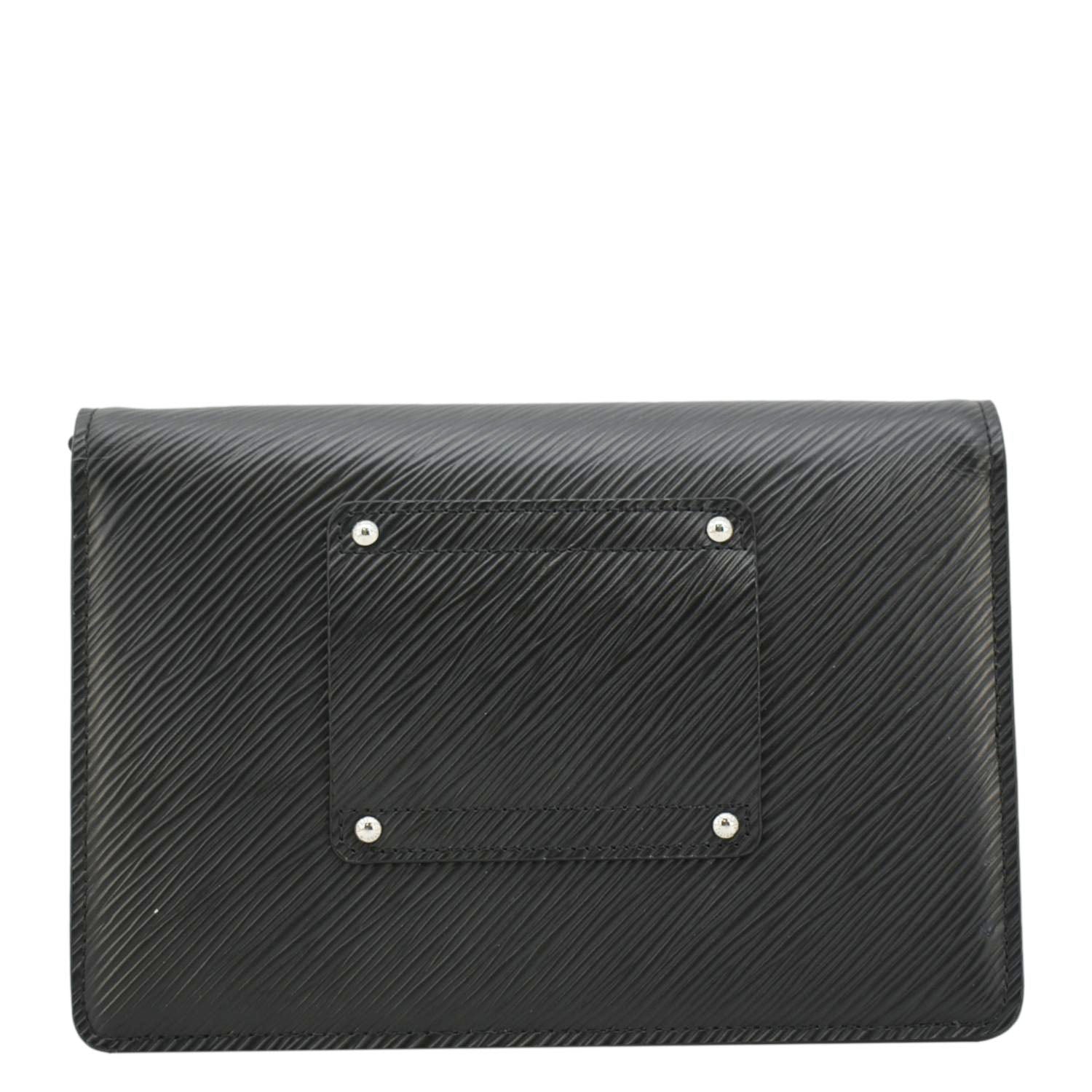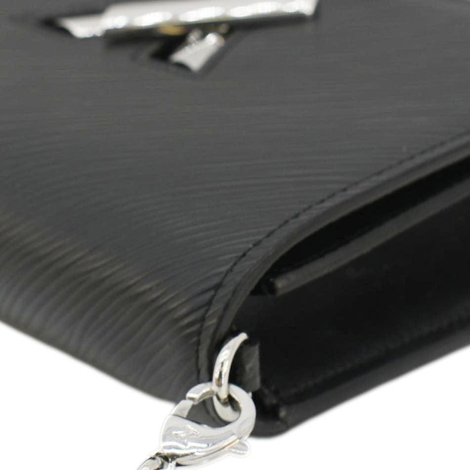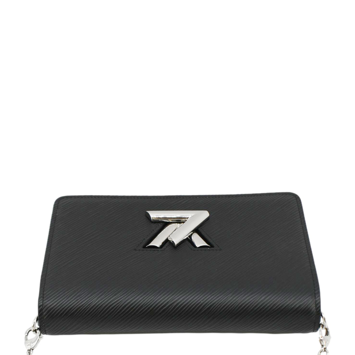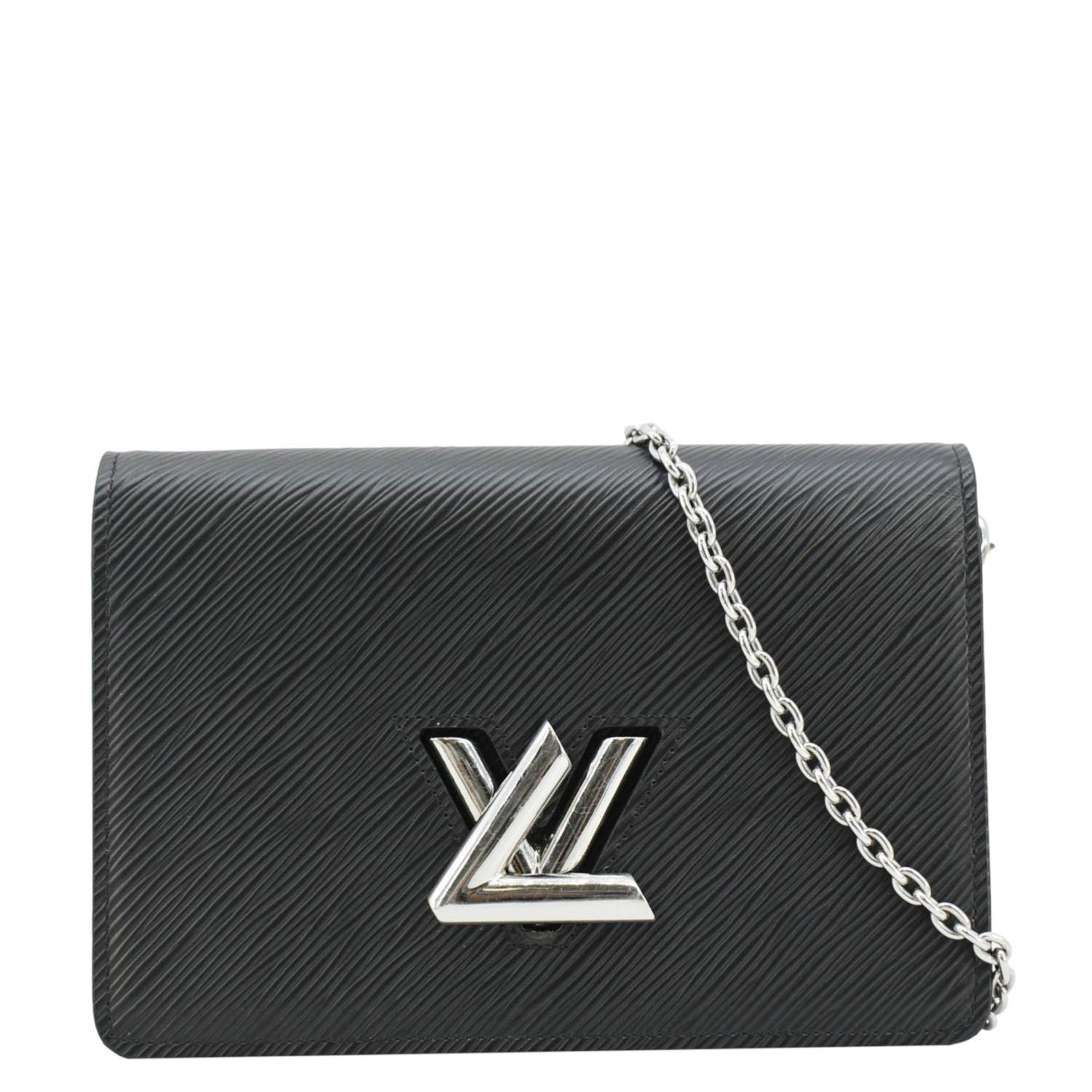The LOUIS VUITTON Twist Epi Leather Chain Wallet Shoulder Bag in Black features distinctive Epi leather and a sleek chain strap. This elegant bag seamlessly combines style and functionality.