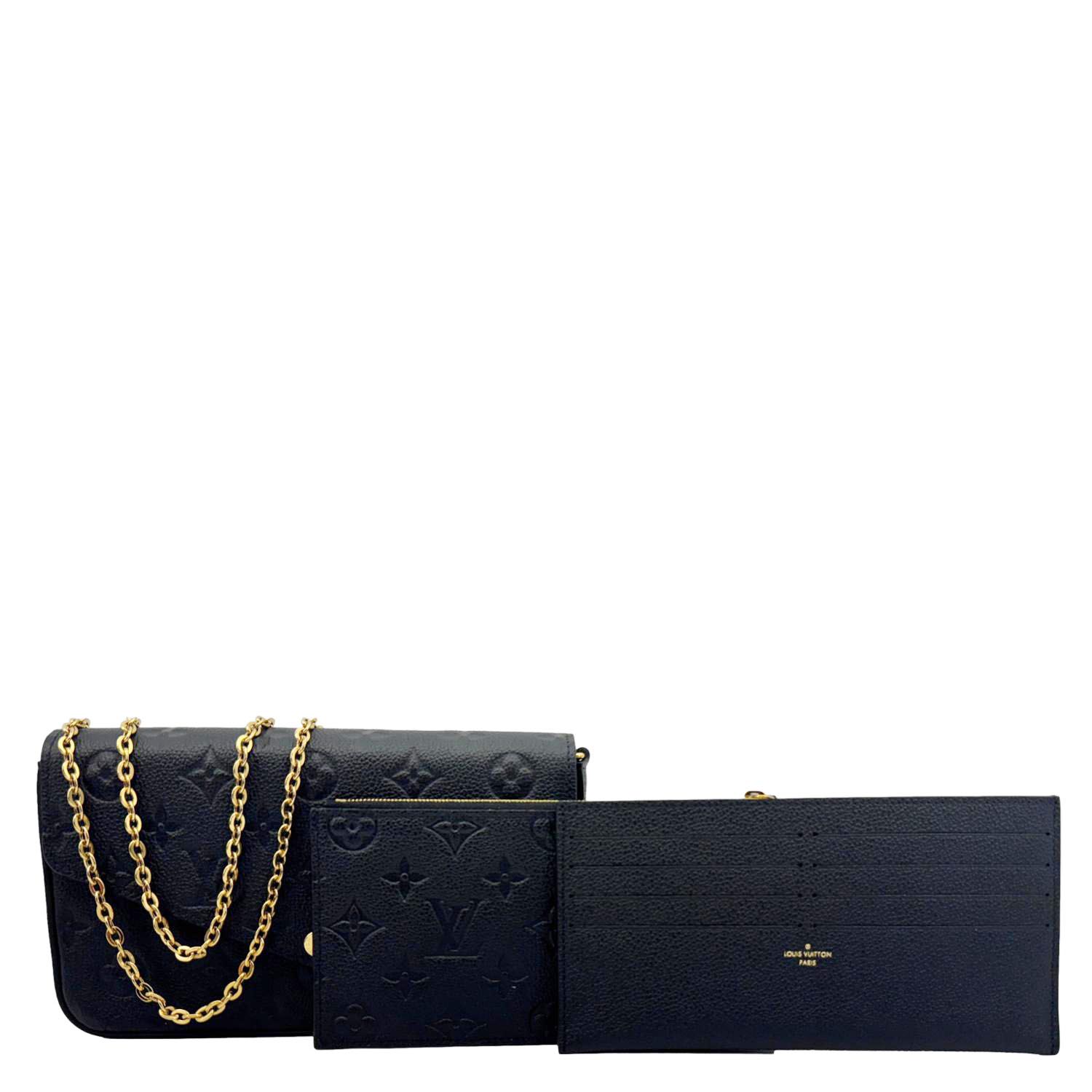 The LOUIS VUITTON Félicie Pochette in Black Monogram Empreinte Leather features an elegant envelope-style flap with embossed signature motifs. Compact yet functional, it includes removable inserts and a gold-tone chain for chic crossbody wear.