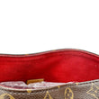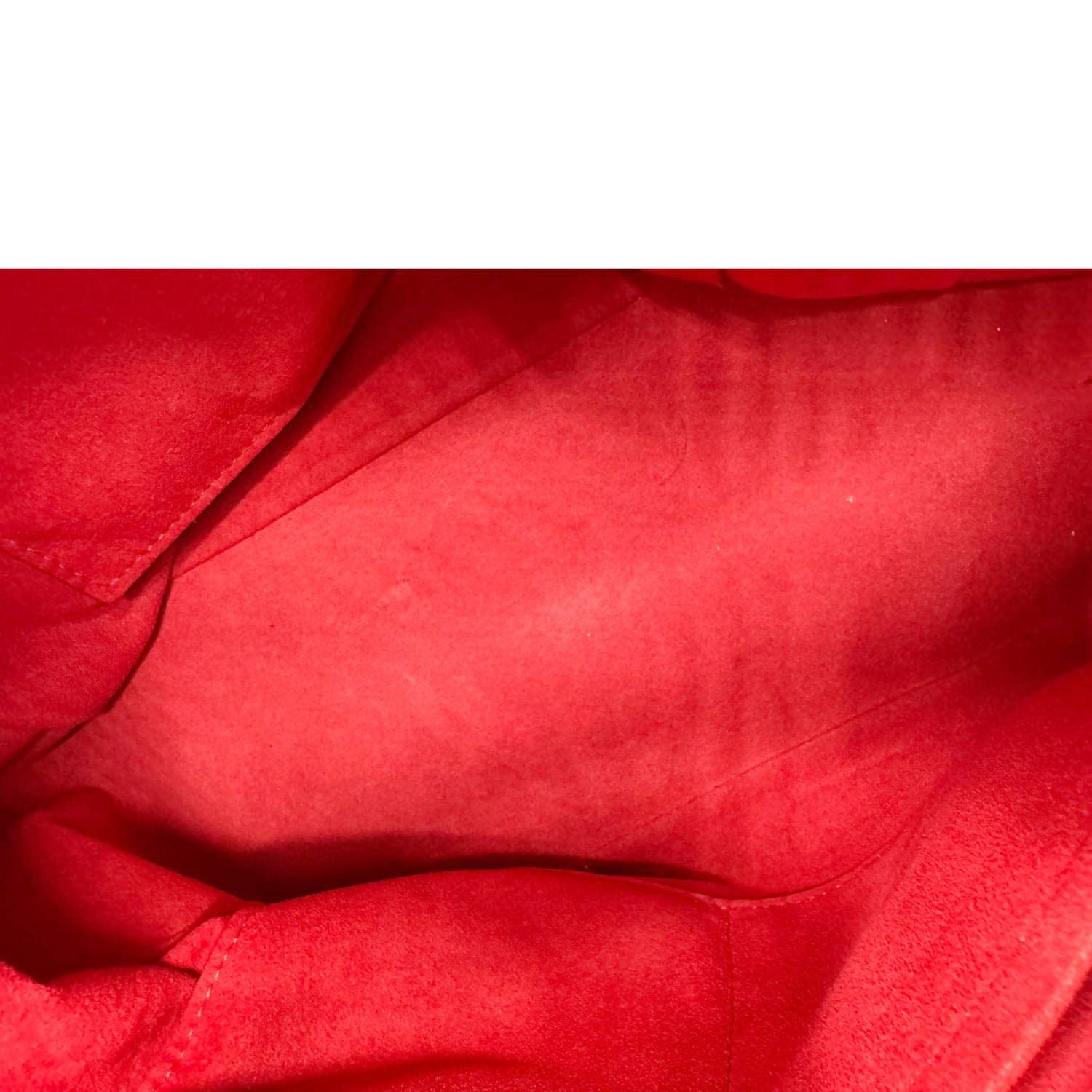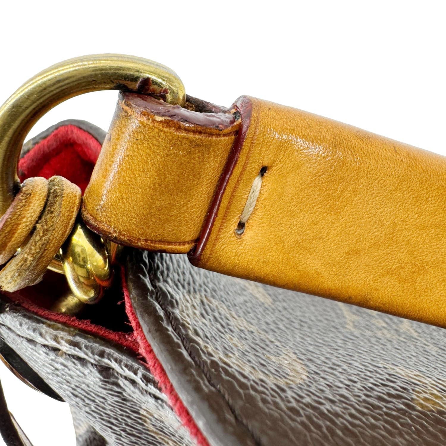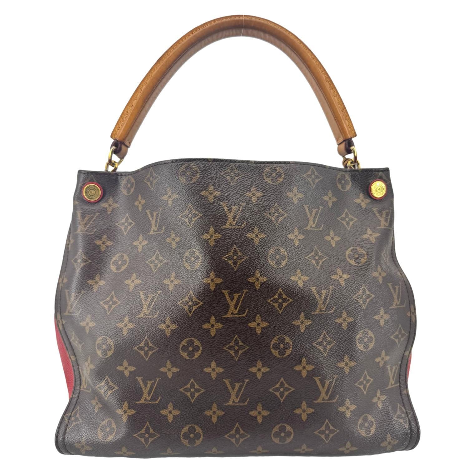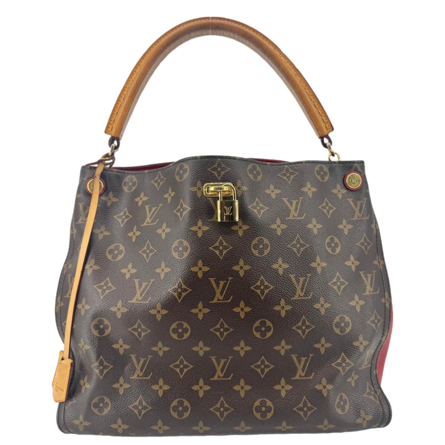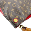 Louis Vuitton Gaia Shoulder Bag combines iconic Monogram canvas with a bold Cerise red leather handle for a striking contrast. Its roomy interior and structured shape offer both style and function for everyday use.