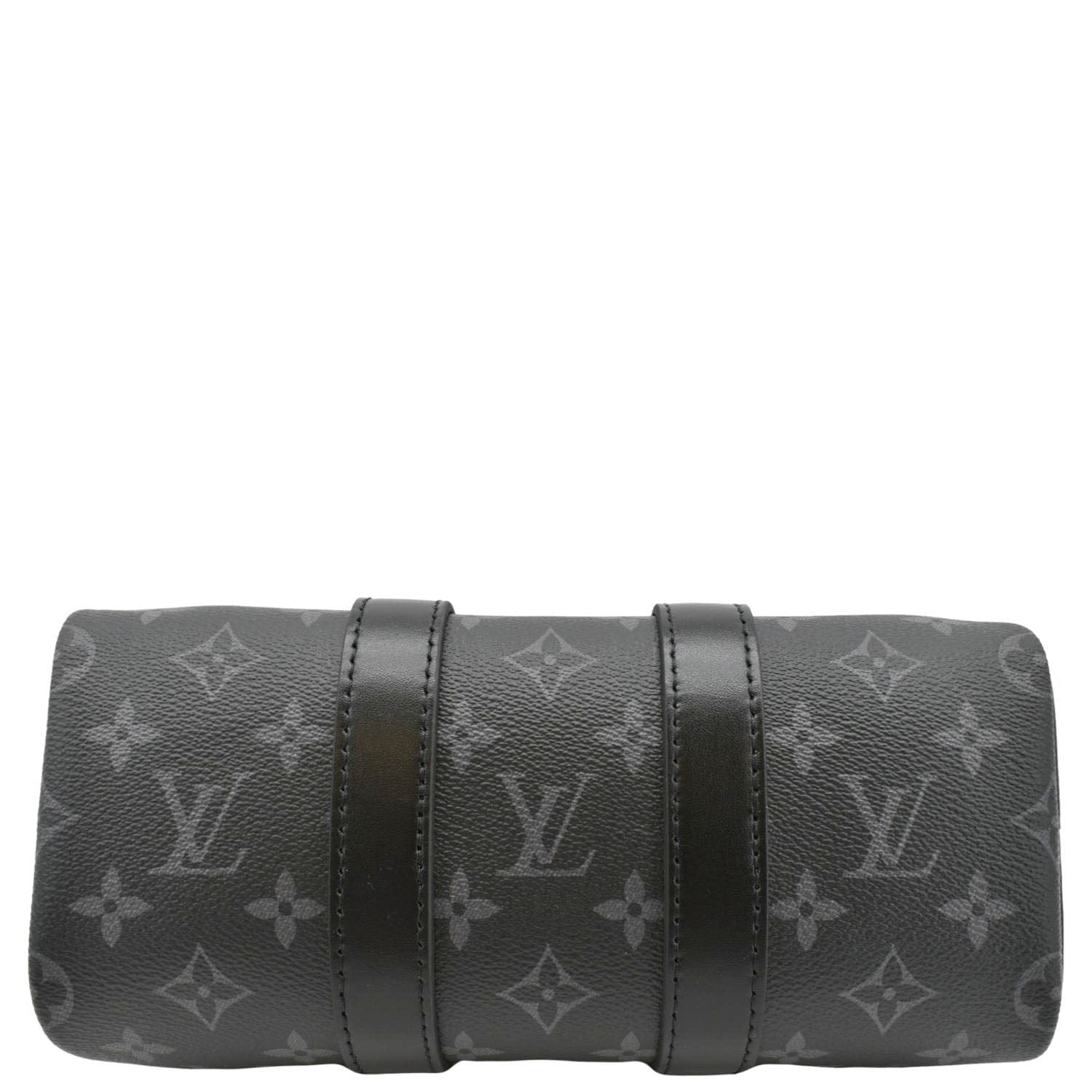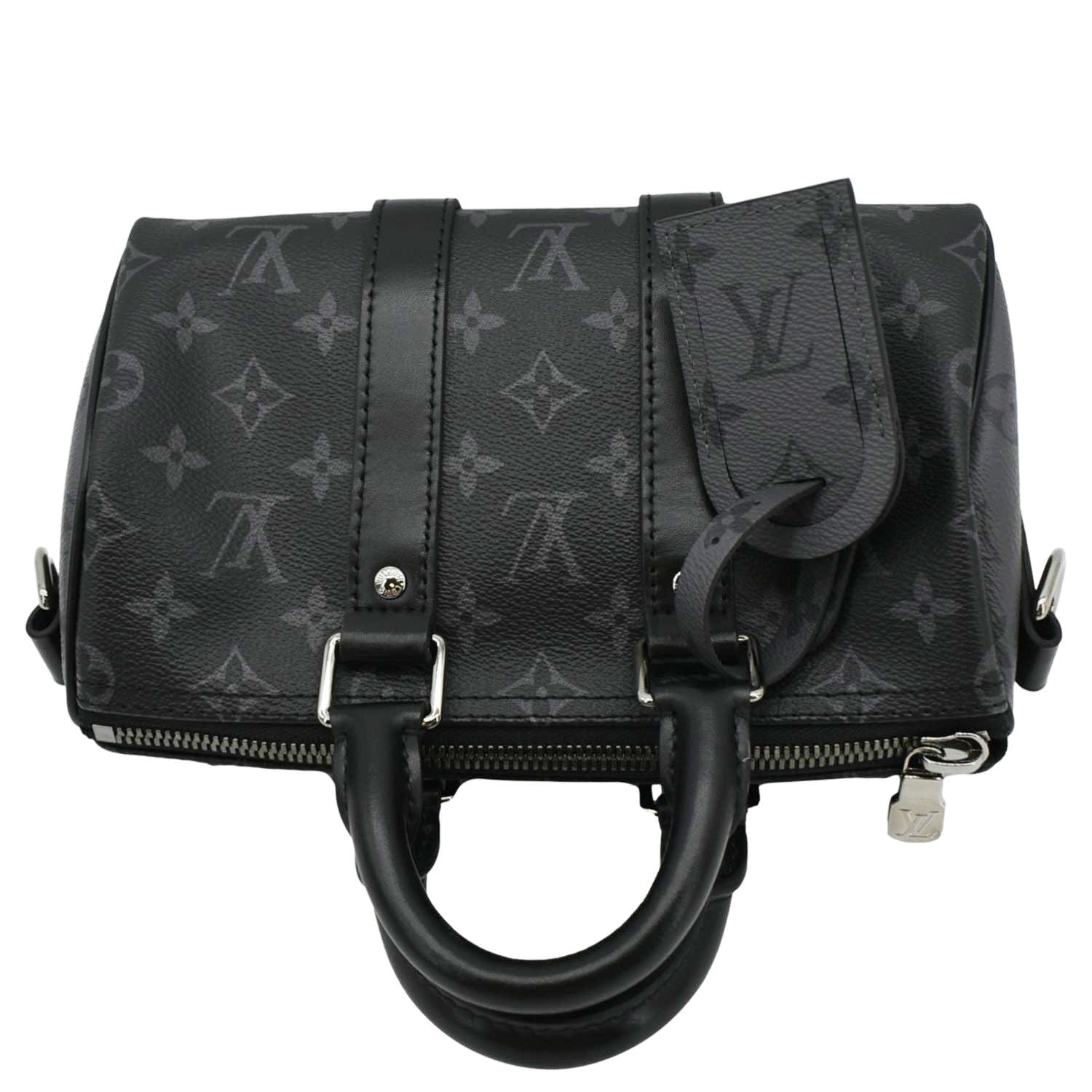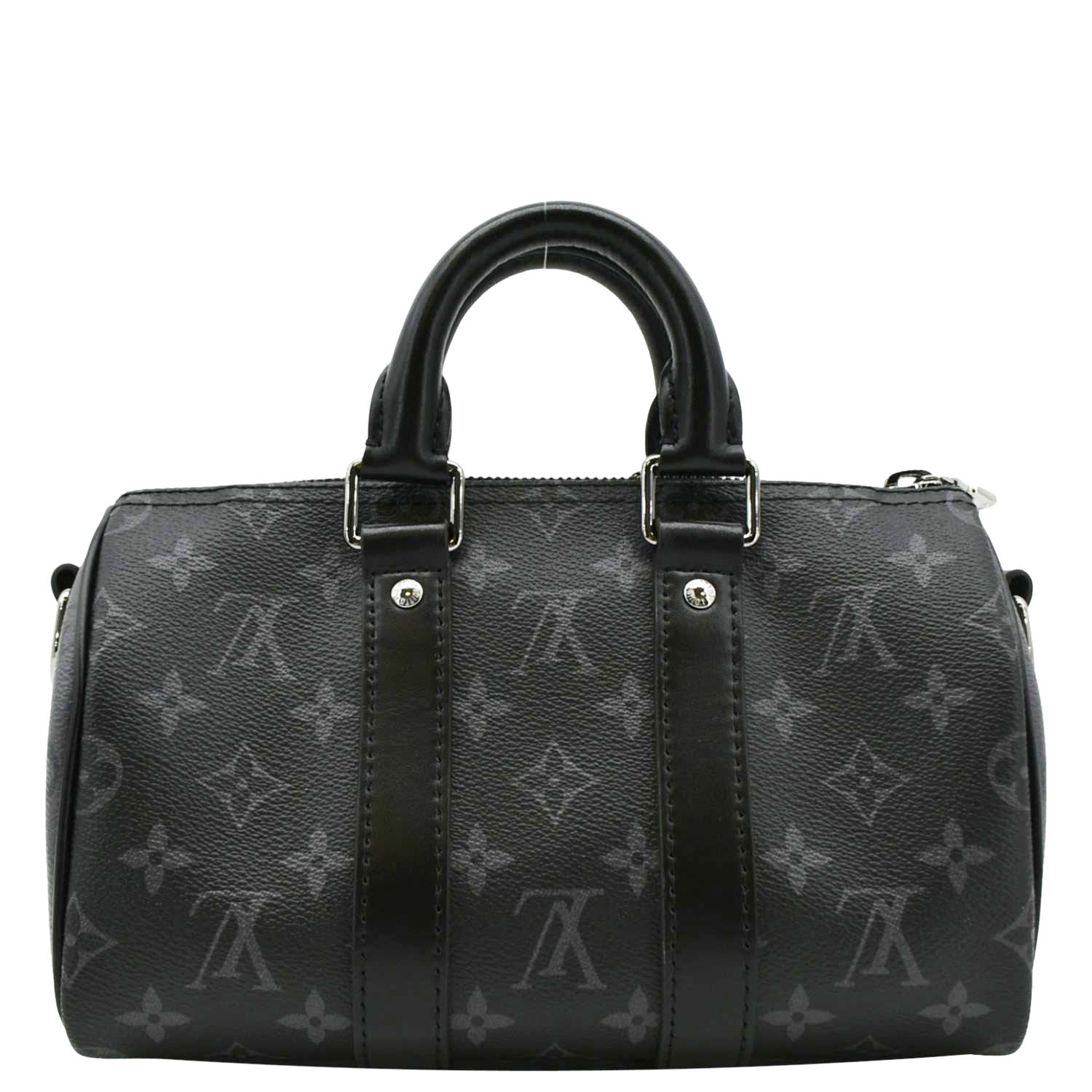 The Louis Vuitton Keepall 25 Bandouliere in Monogram Eclipse Reverse Canvas features a sleek black design with a signature LV monogram. This versatile shoulder bag offers a compact yet spacious interior, perfect for stylish travel or daily use.