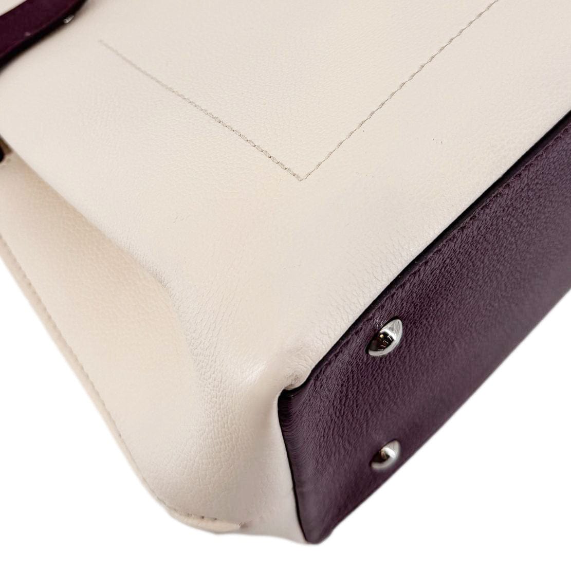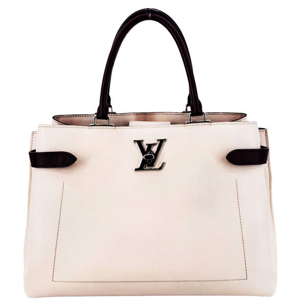 The Louis Vuitton Lockme Day Tote in cream calfskin leather features a structured silhouette with rolled leather handles, a detachable shoulder strap, and subtle LV branding for understated elegance. Its supple, pebbled texture and spacious interior make it a refined yet practical choice for everyday luxury.