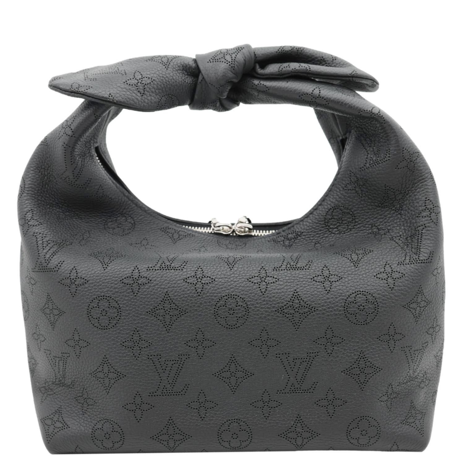 The LOUIS VUITTON Why Knot MM in Monogram Mahina leather features a sleek black finish with elegant perforated detailing. Its unique knotted silhouette and soft leather make it a stylish yet functional shoulder bag.