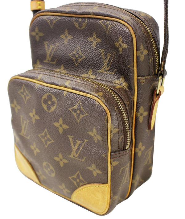 Louis Vuitton Monogram Canvas Amazone Bag is perfect for daytime style. The Amazone's squared shape is reminiscent of classic camera bags. Scaled for cell phone, wallet, and smaller essentials, with a convenient small inside pocket, an open outside pocket, and zip closure, this bag is great for sightseeing or if you're feeling like traveling light for the day.