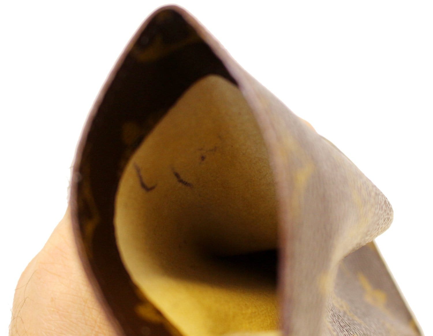 Visible Scratches, rubbed corners, leather tanning darkening. inside stains |