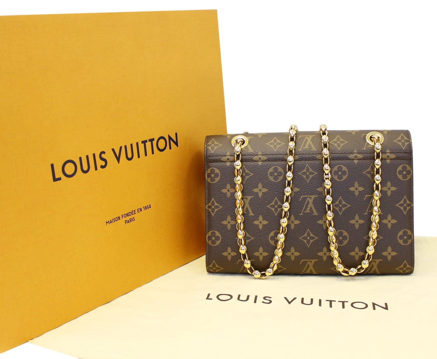 Louis Vuitton Victoire showcases the brand's affinity for their historic trunks. Featuring signature Louis Vuitton Monogram coated canvas with colourful calfskin leather, the slide-lock on the front is a reinterpretation of the fashion house's classic designs. The Victoire is both modern and classic, with a gleaming chain strap that allows you to carry this bag from day to night.