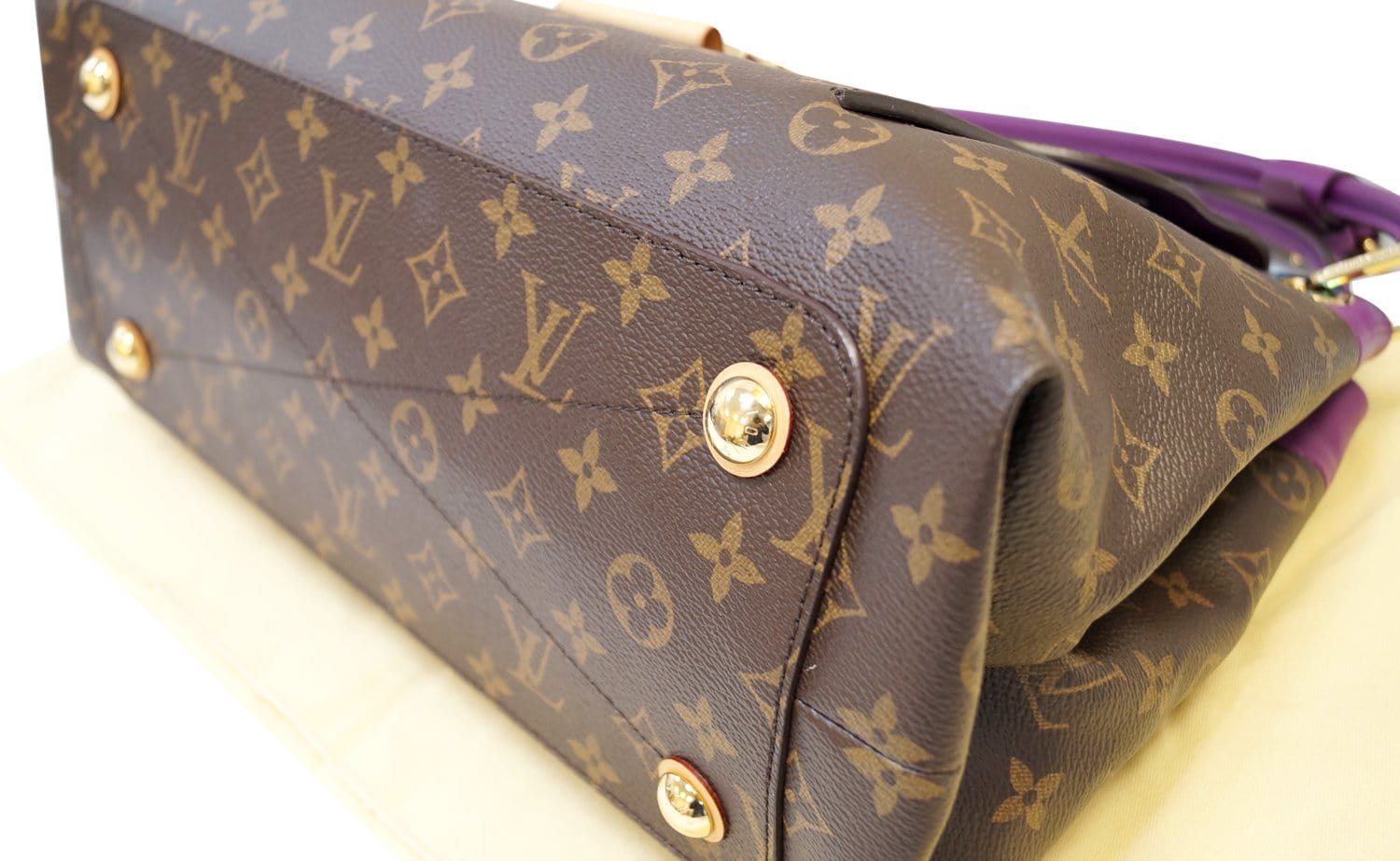 A newer creation from Louis Vuitton, the Olympe is a refined and sophisticated tote that will be treasured for years to come. Taking inspiration from Louis Vuitton luxurious heritage, the Olympe is a blend of the iconic Monogram canvas and Purple colored calf leather with golden brass details and sleek rolled Toron handles.