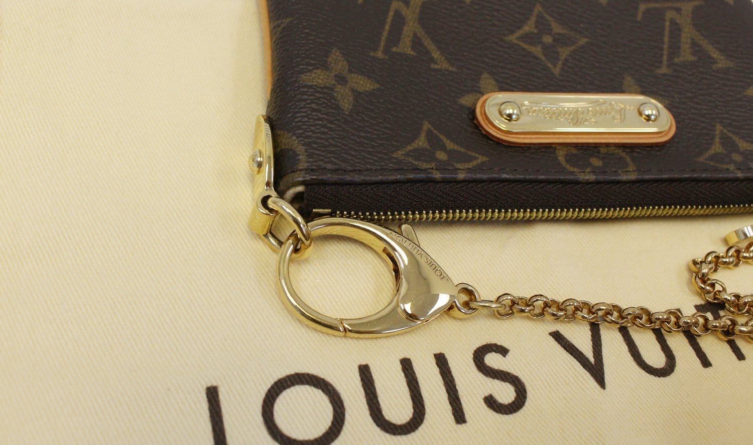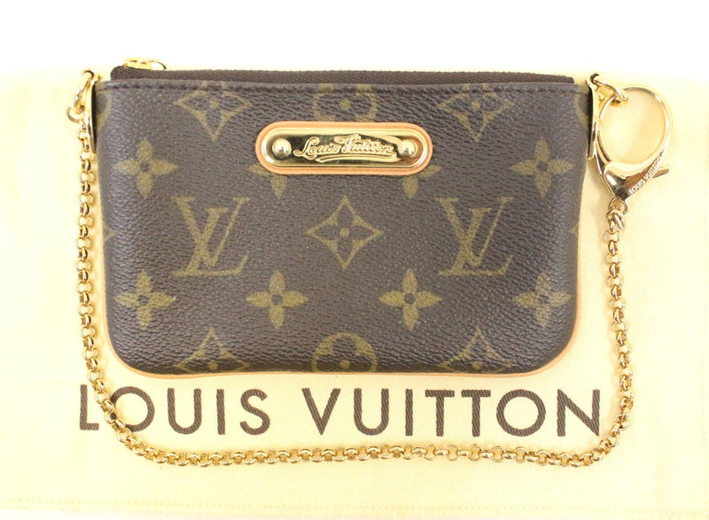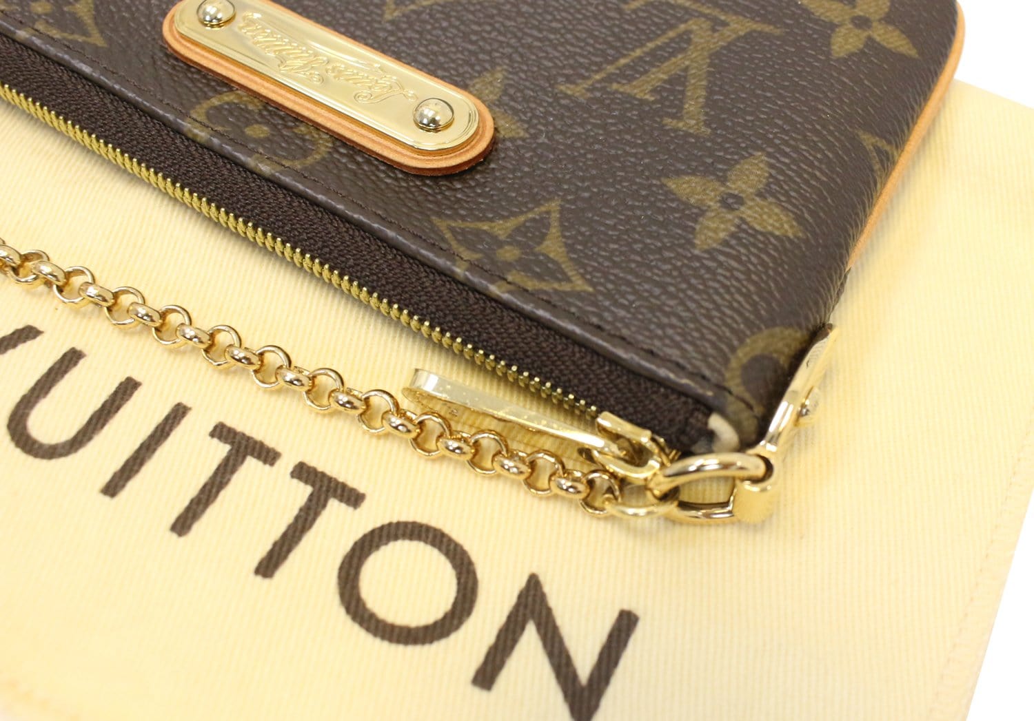 Louis Vuitton Monogram Canvas Milla Clutch PM Bag is ideal for holding your cards or smart phone essentials in a fun and elegant manner. It features leather corner detailing and an elegant chain strap.