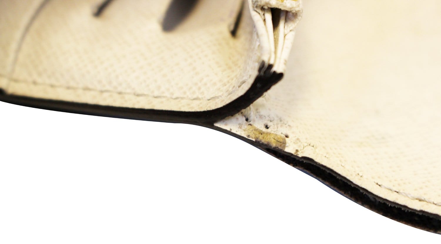 Edges: Scratches, rubbed, Tear, broken stitches, visible signs of use.