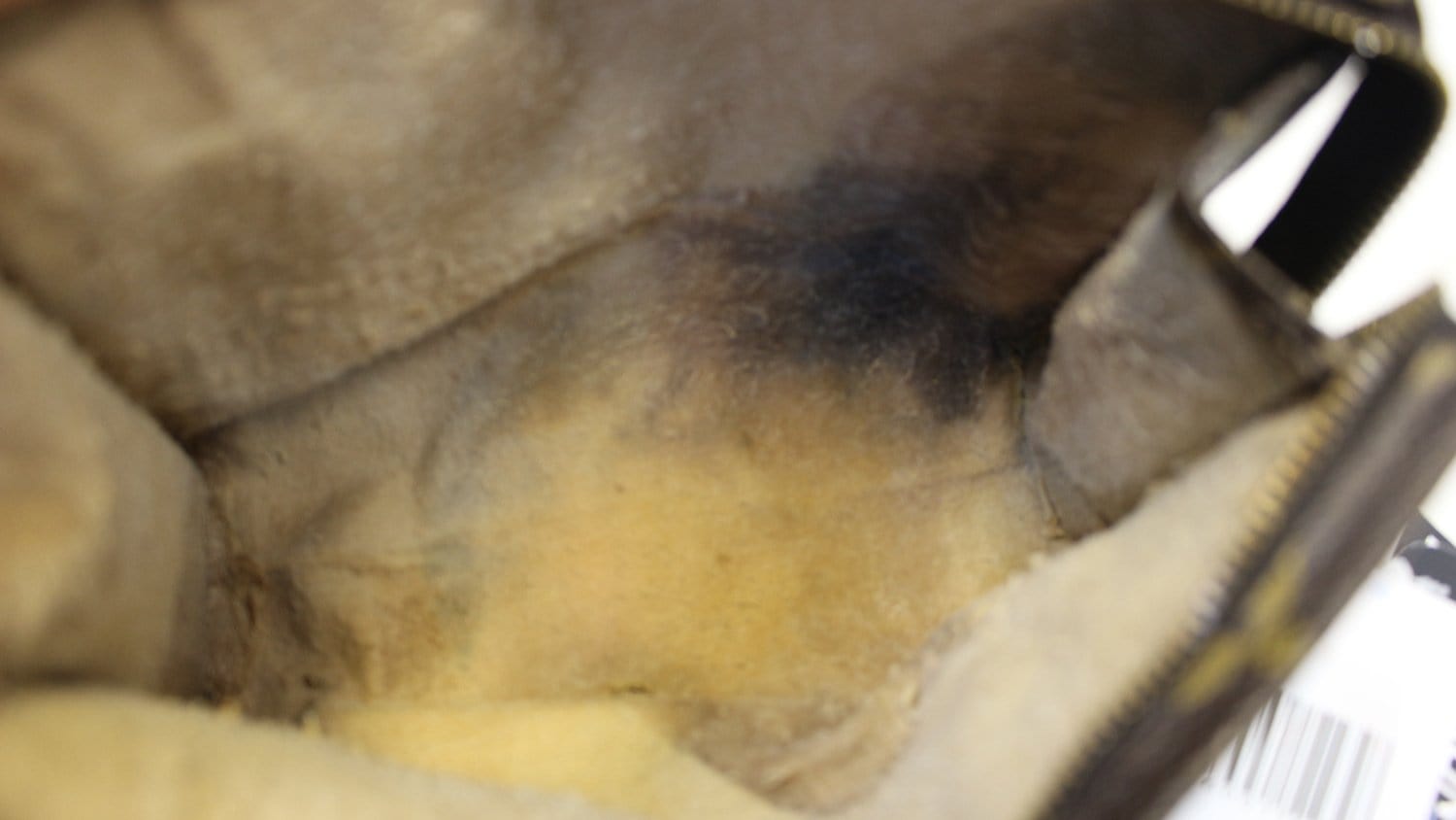 Visible Scratches, rubbed corners, leather tanning darkening. inside stains
