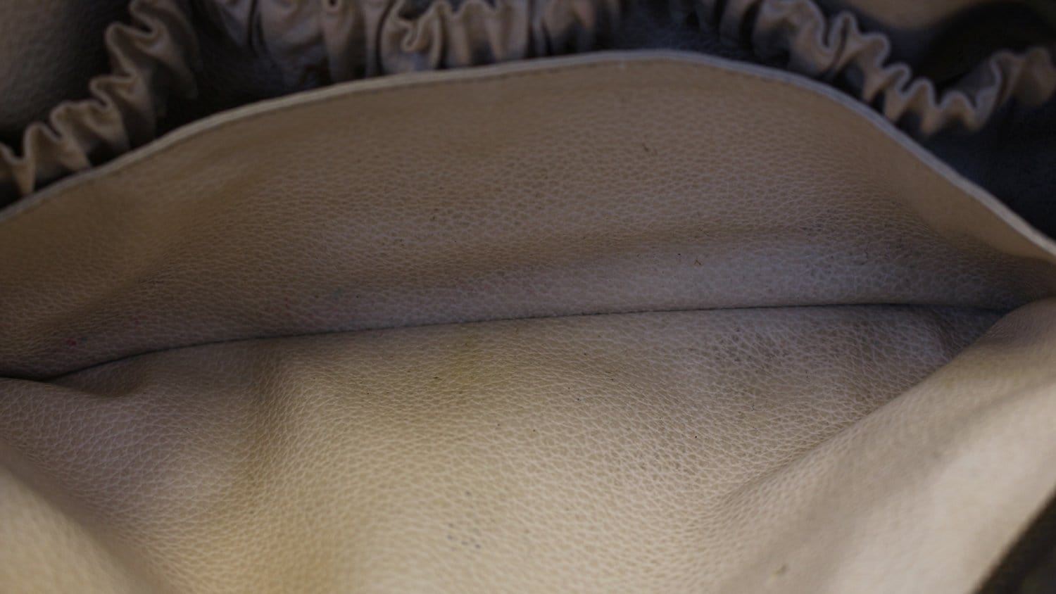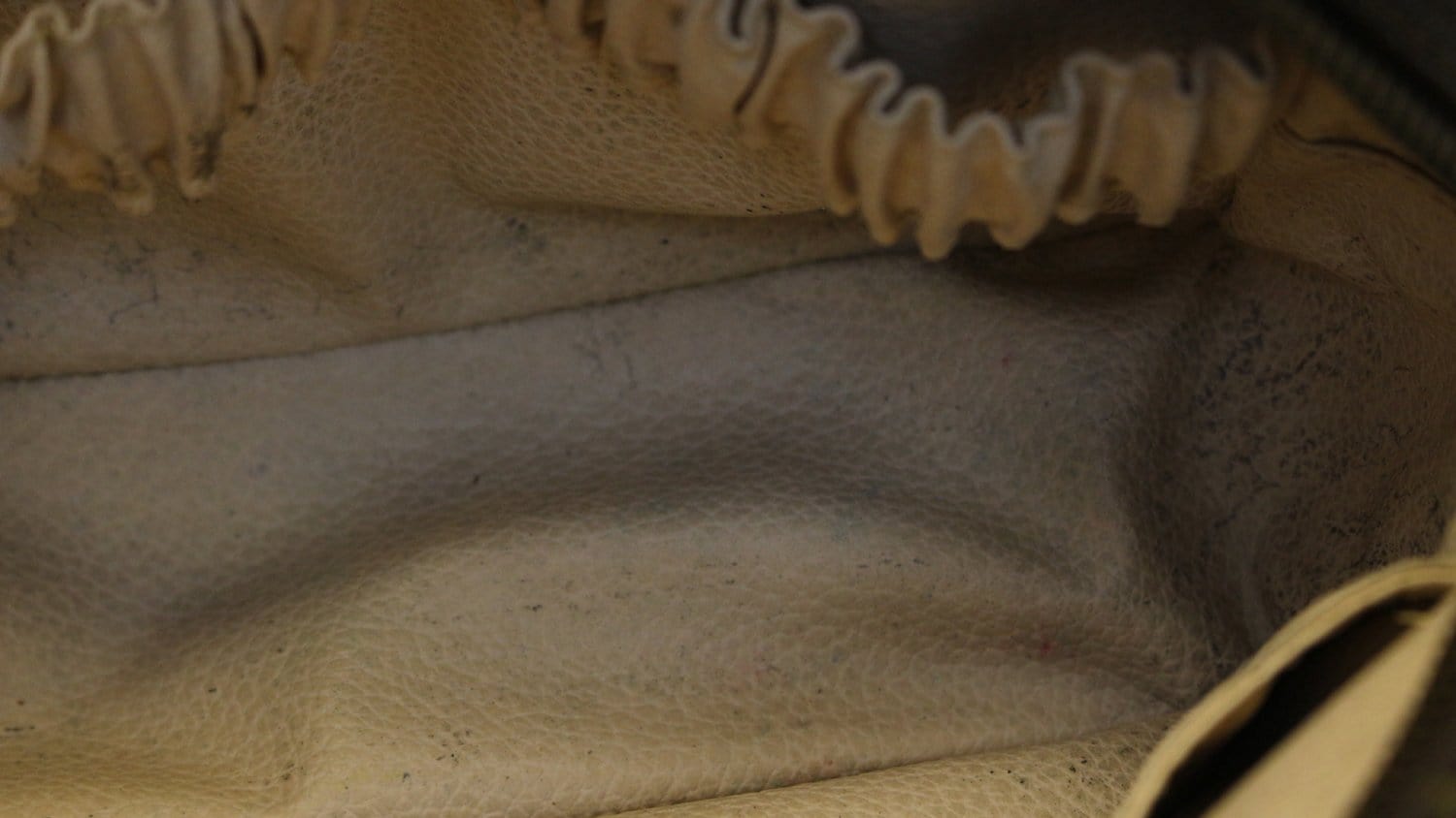 Visible Scratches, rubbed corners, leather tanning darkening. inside stains |