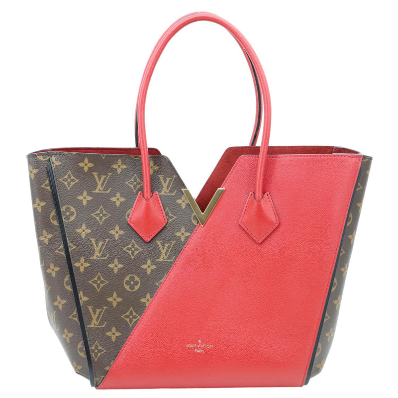 The LOUIS VUITTON Kimono MM features Monogram canvas with bold red leather and a signature V cut design. A chic tote with spacious interior and elegant, structured form.