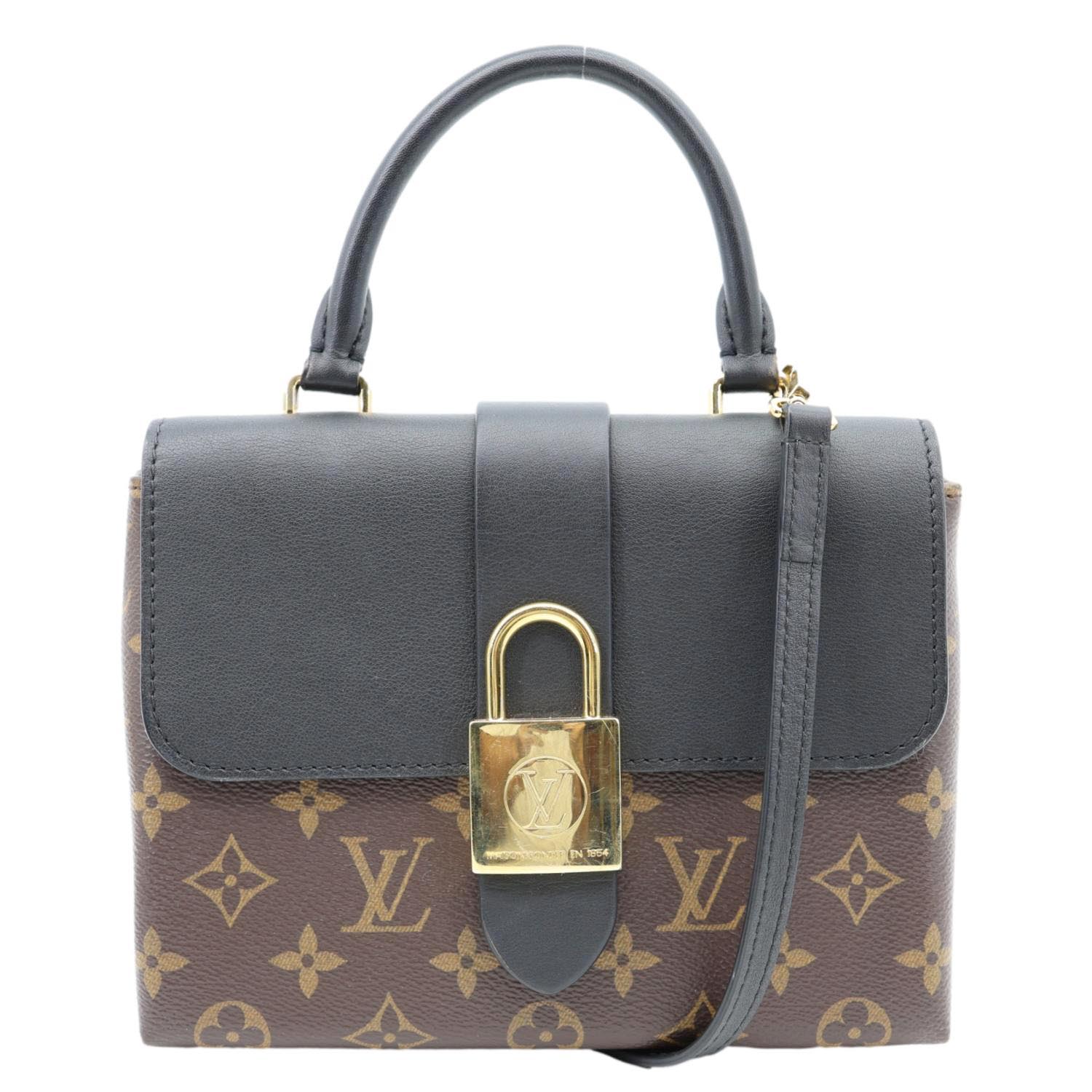 The LOUIS VUITTON Locky BB in brown Monogram canvas features a bold gold-tone padlock and smooth leather trim. Compact yet chic, it offers versatile carry with a top handle and removable crossbody strap.