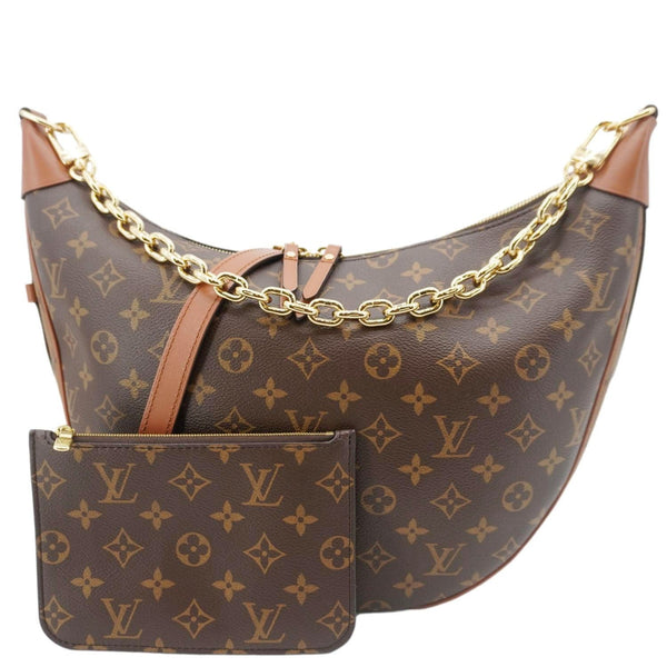 The Louis Vuitton Loop Hobo Shoulder Bag in Reverse Monogram Canvas features a crescent-shaped design, gold-tone hardware, and a stylish mix of classic and reverse monogram patterns for a contemporary touch.