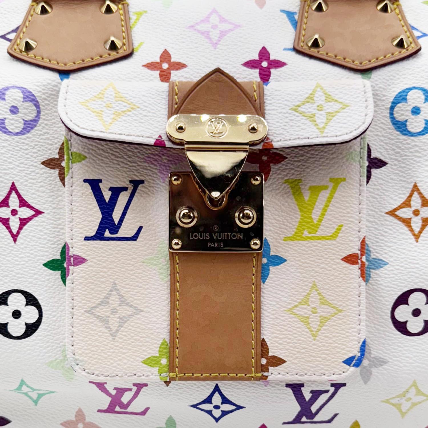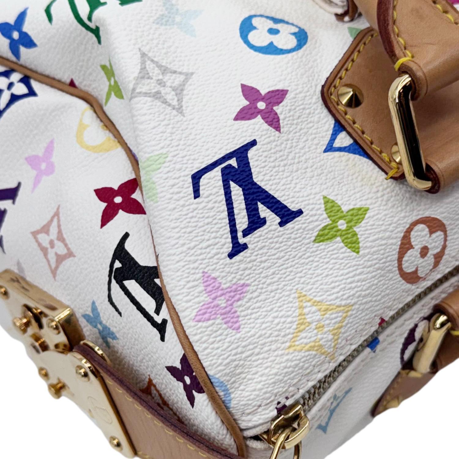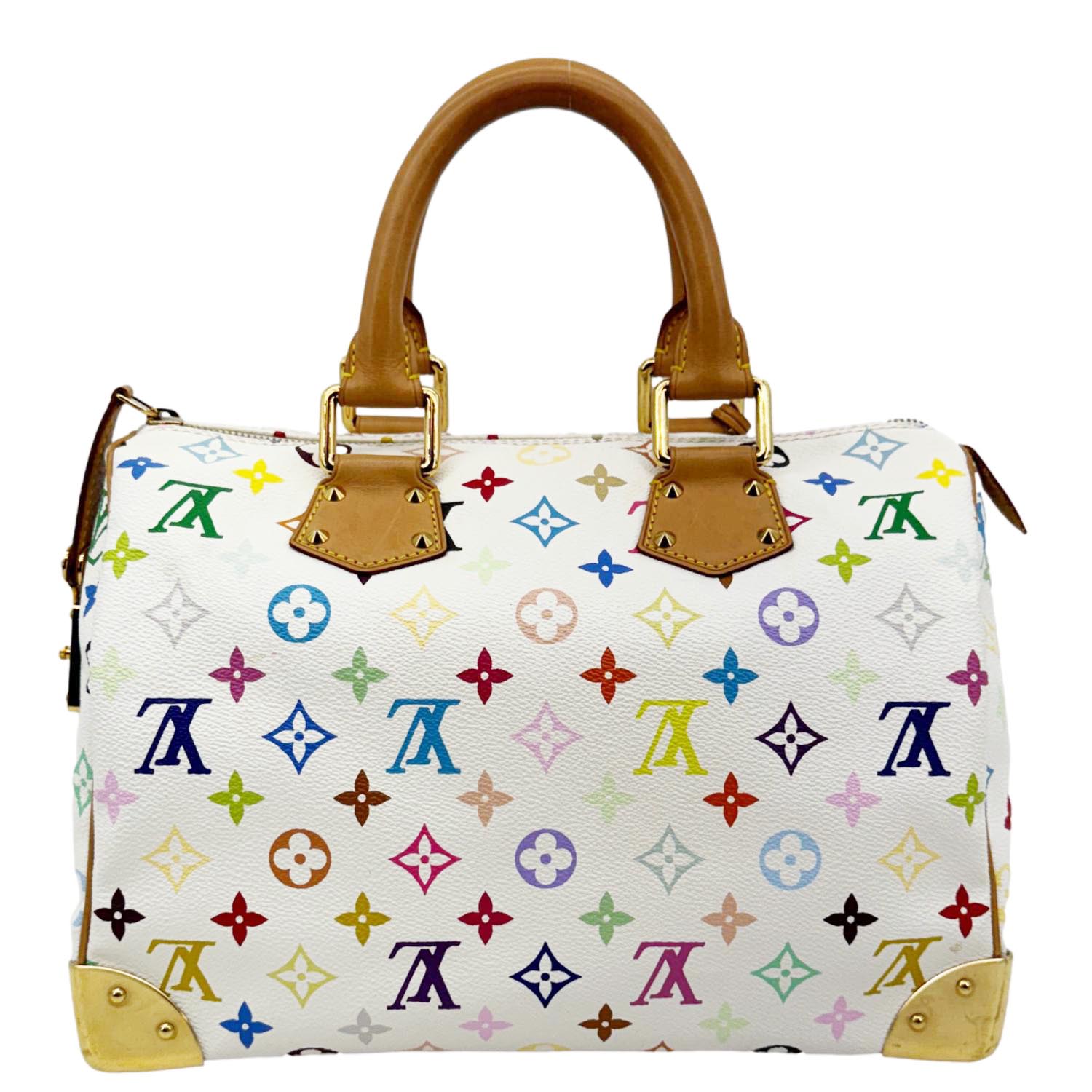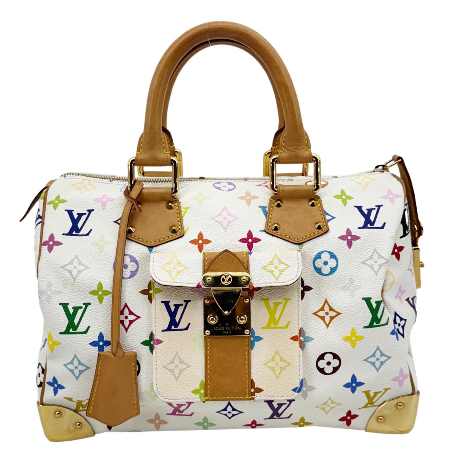The LOUIS VUITTON Speedy 30 Monogram Multicolor Satchel is a vibrant twist on a classic, crafted in white canvas with bold multicolor LV monogram and natural leather trim. Spacious and iconic, it's a standout piece from the Takashi Murakami collaboration.
