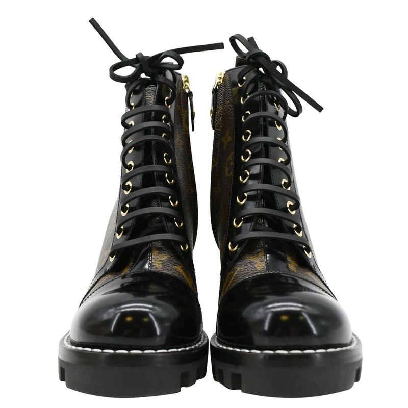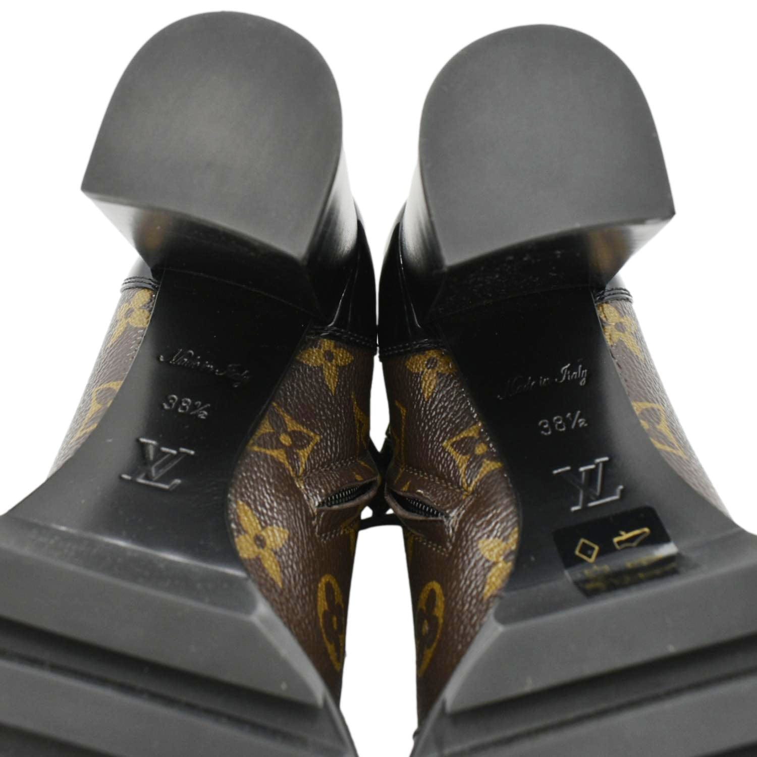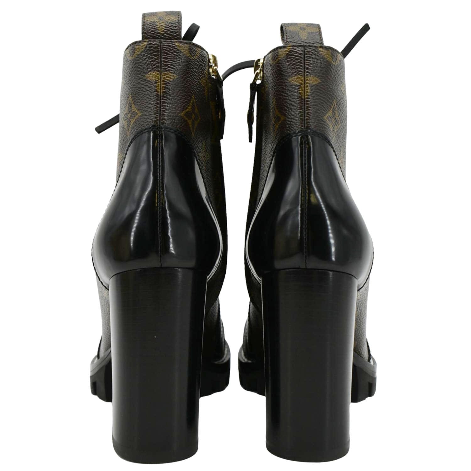 The Louis Vuitton Star Trail Ankle Boot in Monogram Canvas features the iconic LV pattern and black leather detailing. Size 38.5, these stylish boots offer a chic, elevated look with a chunky heel and treaded sole.