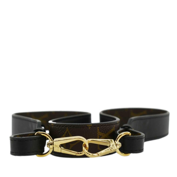 The Louis Vuitton Monogram Canvas Strap in brown features the iconic LV monogram pattern and gold-tone hardware. It is a versatile accessory designed to attach to bags, offering style and comfort for crossbody or shoulder wear.