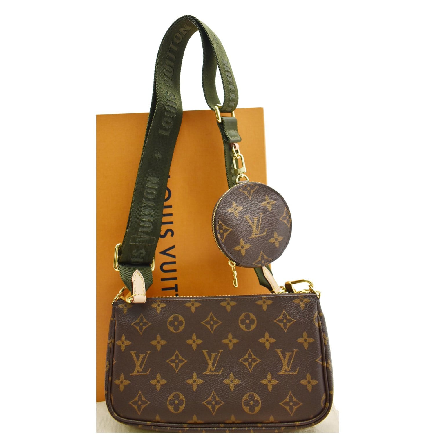 Accessories: Green Shoulder Strap, Box, Chain, and Dust Bag.