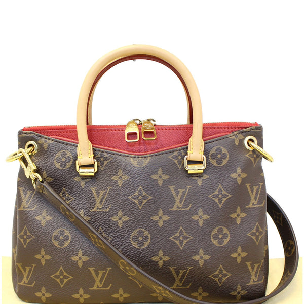 Louis Vuitton Nano Pallas Bag is the smallest version of the Pallas line. It features iconic Monogram canvas and red calf leather for a classic look.