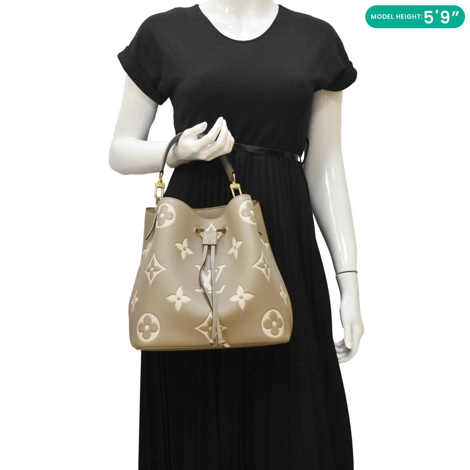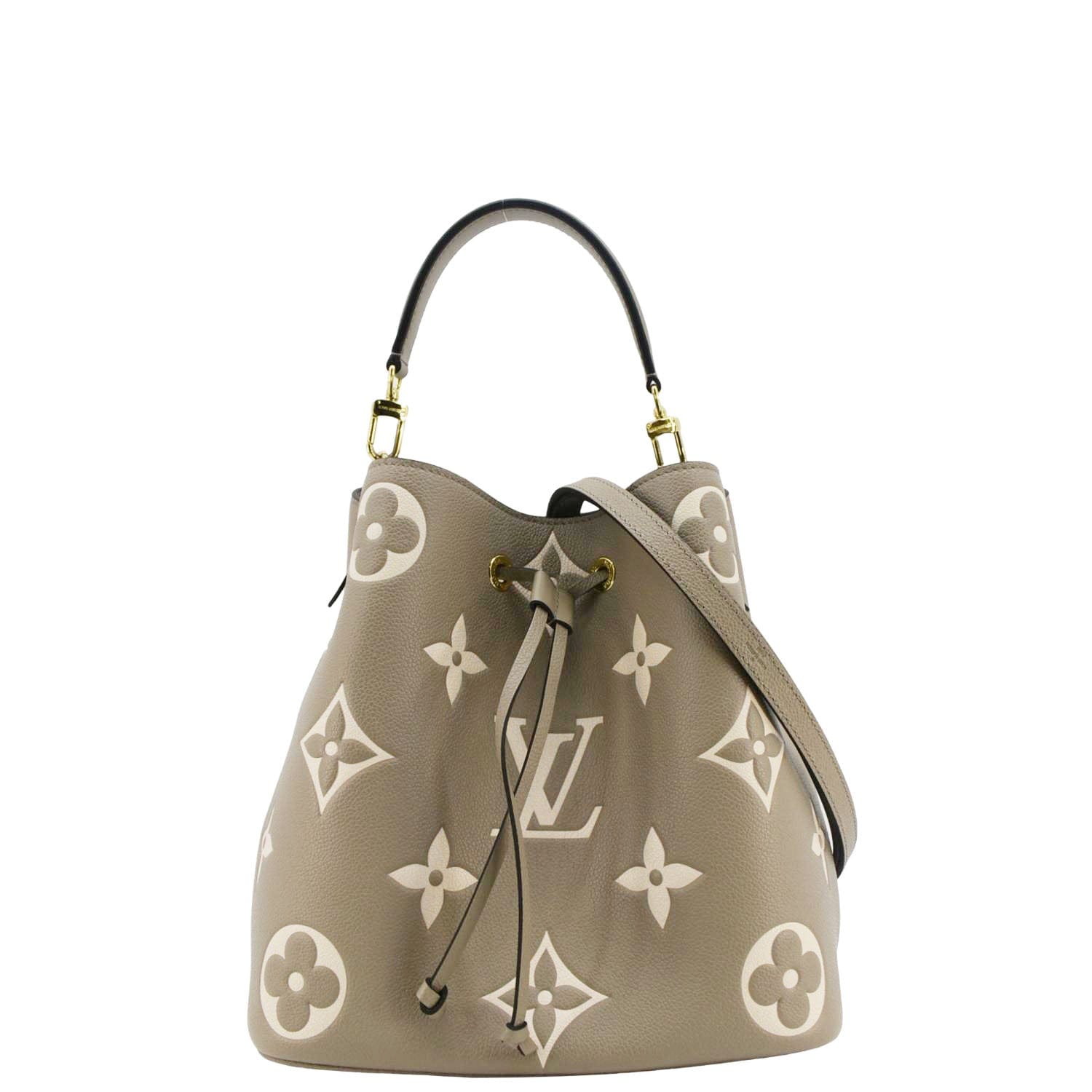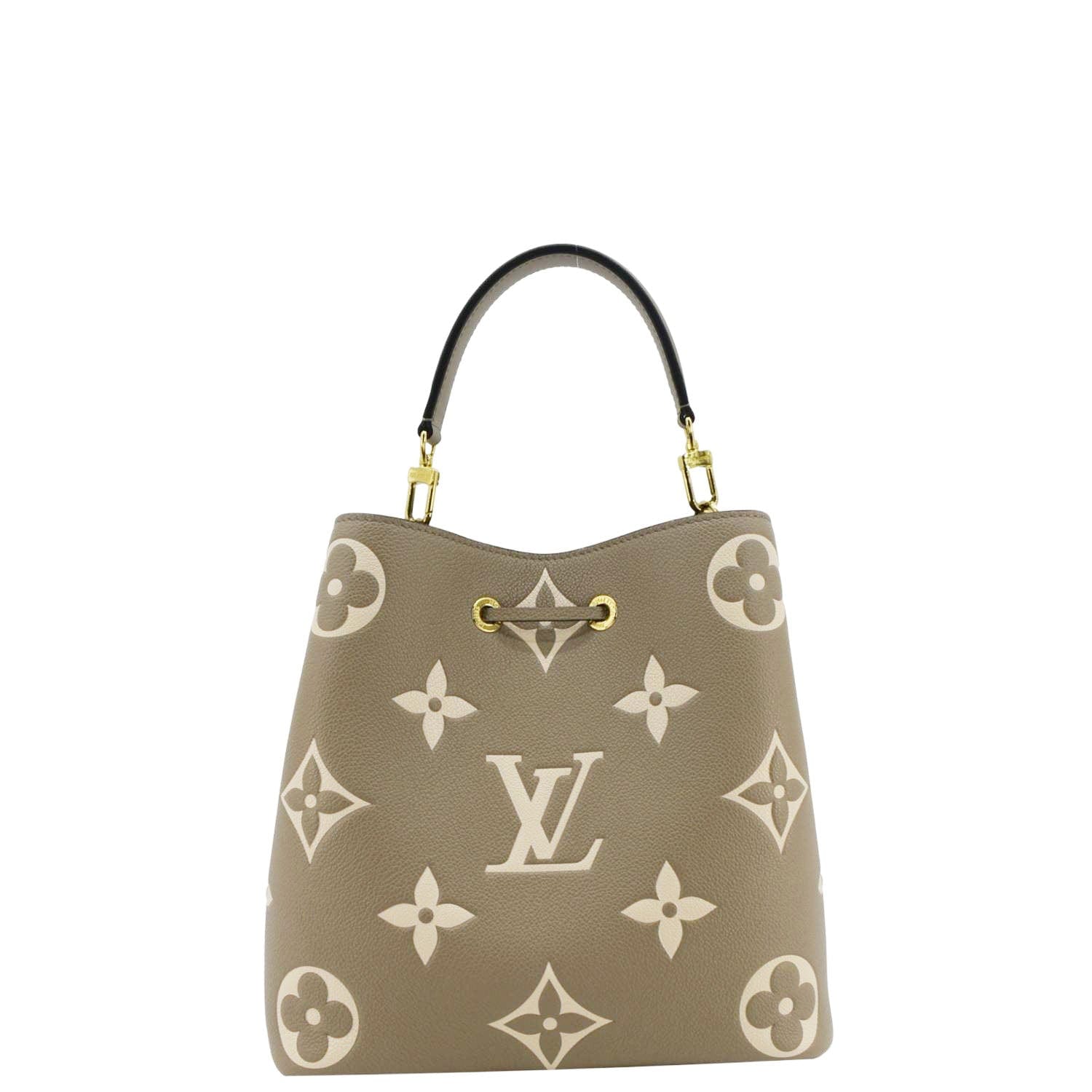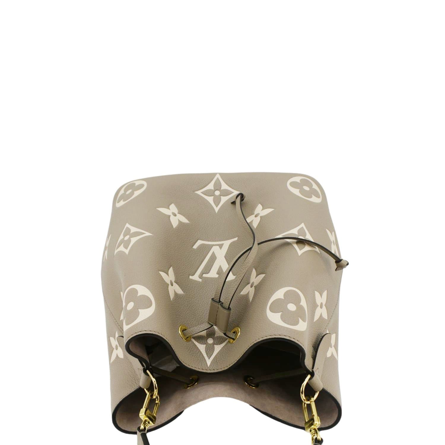 The LOUIS VUITTON NeoNoe MM Bicolor Monogram Empreinte Shoulder Bag in Cream features luxurious embossed leather with a bicolor monogram design. This elegant bag offers a drawstring closure and adjustable strap, perfect for versatile, everyday use.